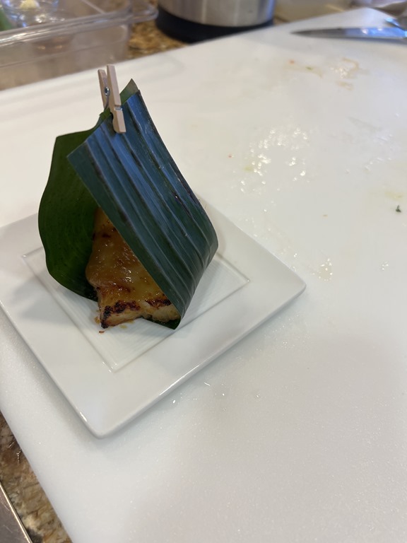This is the Miso-glazed sea bass which is served just like this in the leaf in the Red Ginger restaurant on board.