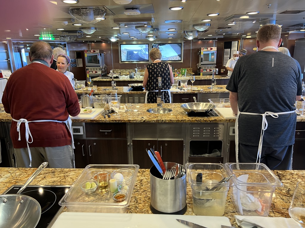 Our instructor, Noelle, a graduate of the Culinary Institute of America. She has been teaching on ships for 10 years and is terrific. She demonstrates and then we go back to our stations to make each recipe.