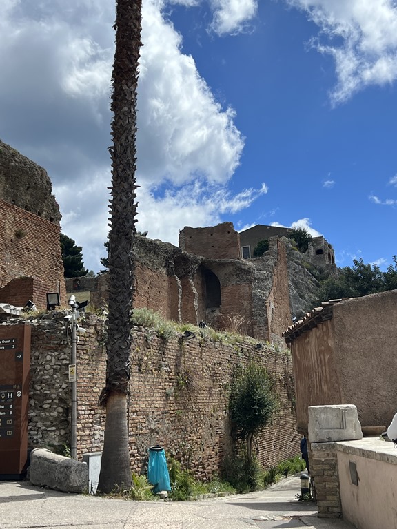 We drove to Taormina which is located high on a cliff (200 meters above sea level) just below Castelmola. Here is a view of that town.