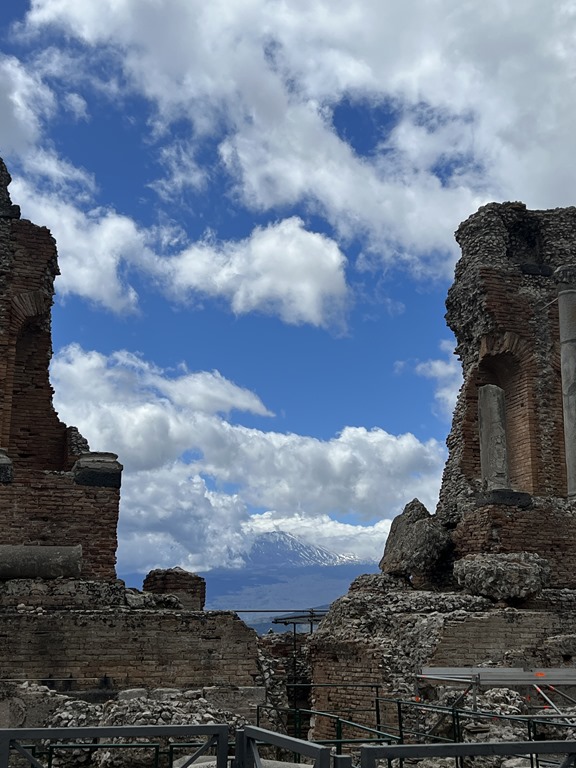 Anyway, we got on our way by 9:40 for our trip to Taormina and Mt. Etna. Our guide was Nadia and the first thing she told us was that we needed N95 or KN95 masks and if we didn’t have them (we did), she provided them. We had to wear them in the bus too. But by now we are well used to that.