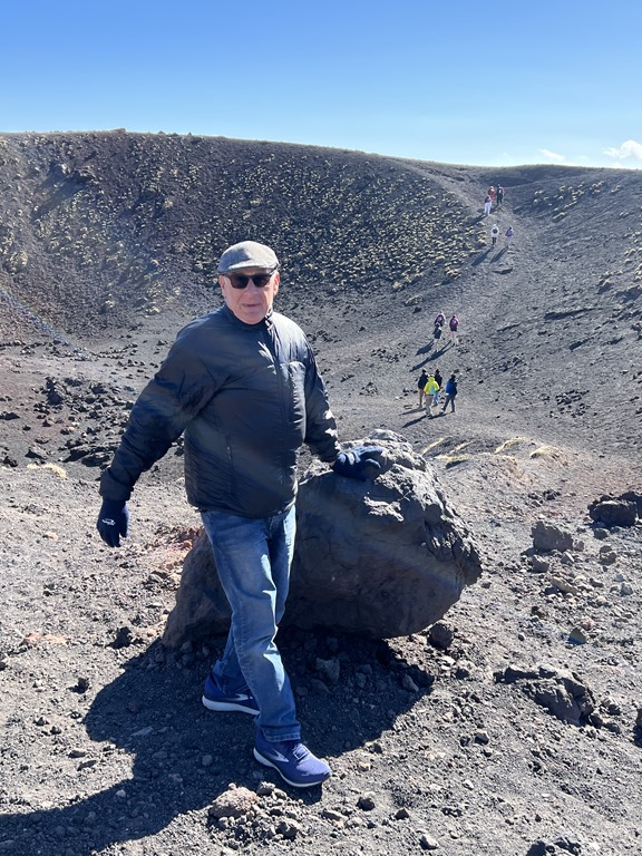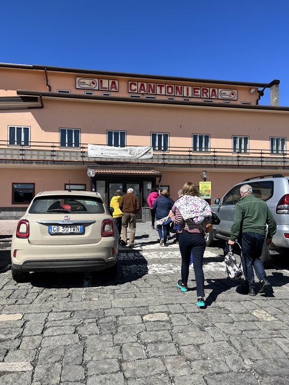 We headed to Mt. Etna where we would first have lunch at a restaurant near the Crater Silvestri (1300 feet from the top) and then visit one of the 200 craters on the 11,000 ft. high volcano. This is an active volcano with 4 active craters and it last erupted two months ago. Nadia said there were 50 eruptions last year. They have warnings and ways to divert the lava so it is very different from 1669 when the lava reached the sea and destroyed the city of Catania, which was rebuilt. It is the highest active volcano in Europe.