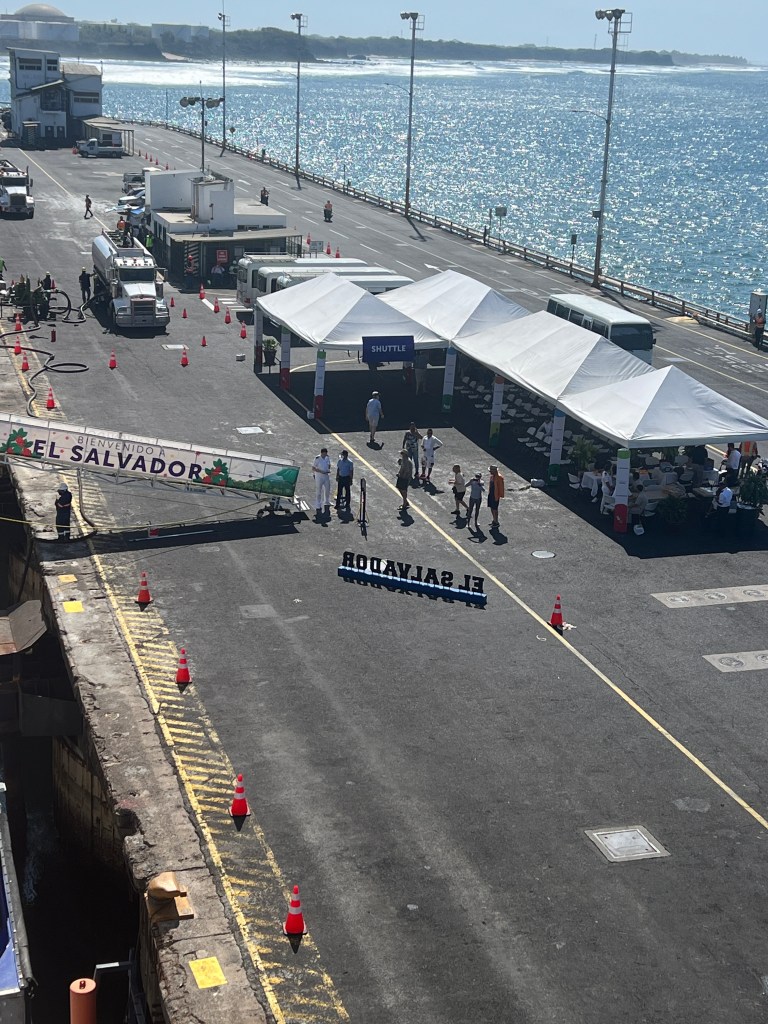 We arrived here in darkness this morning just before our scheduled port time of 6 AM. This is El Salvador’s principal port and handles a large portion of its coffee, sugar and balsam exports. Not too many cruise ships come here. It is interesting to watch the trucks coming and going all day, we assume with products to be loaded and exported on the many ships.