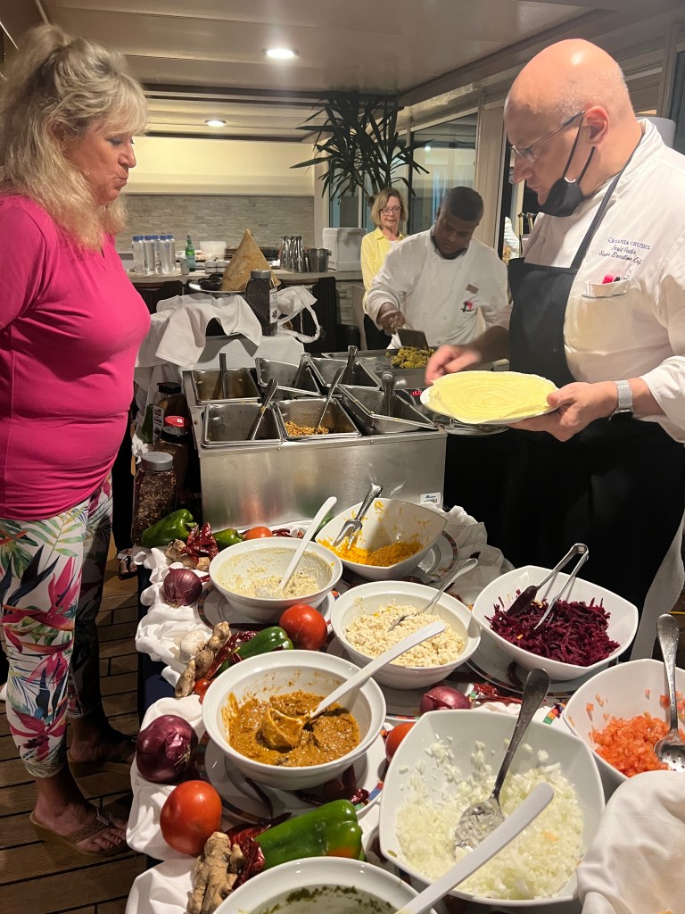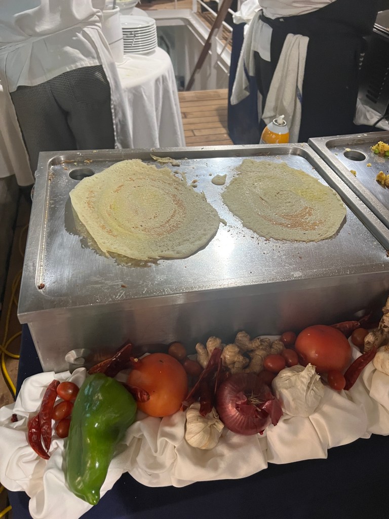 And here is our sunset. After we enjoyed freshly made Indian Dosa on deck, I enjoyed the show and we now have three sea days in a row due to the cancellation of Peru stops because of the conflicts there. One day we will be docked in Peru for supplies but no one can get on or off the ship so it is, for us, the same as a sea day on board.