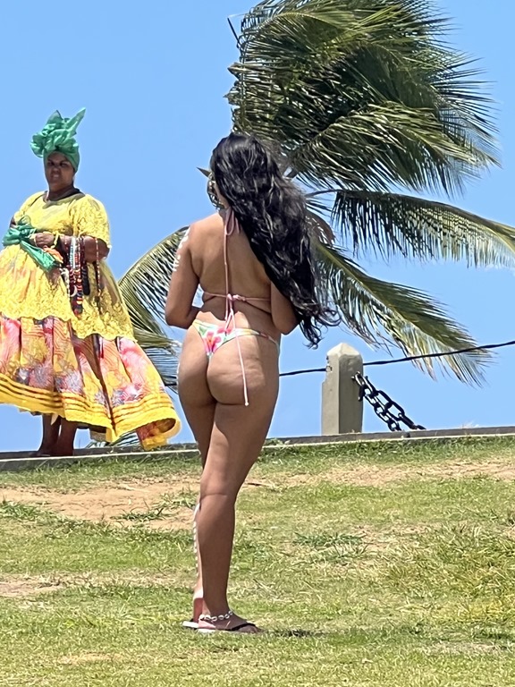 There are many beautiful beaches here. We also visited a lighthouse where the main attraction outside seemed to be this woman covered in either body paint or tattoos! Many of the women, no matter what their shapes, seem to wear thong bikinis. This one could pull it off pretty well!