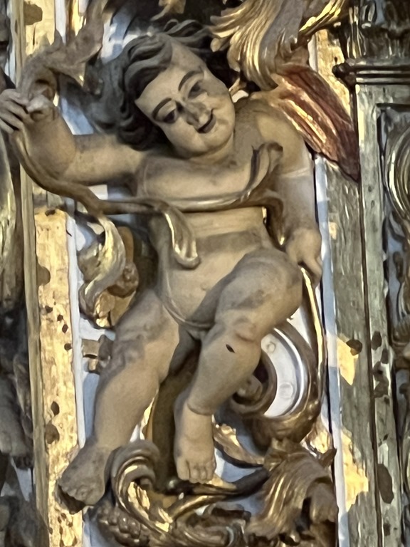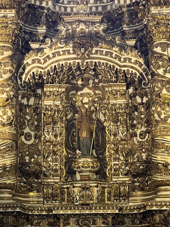 We did about 2 hours of walking through areas of the city and we were pretty hot and tired. My ankle held up OK, some swelling but really no pain to speak of. We visited several baroque churches, all inlaid with gold. The African slaves did the carving, but in spite of being converted (or pretending to be converted) to Catholicism, they were not permitted inside the church for any services. In one church, the Franciscan, the slaves showed their protest by making ugly faces on some of the cherubs in the church.