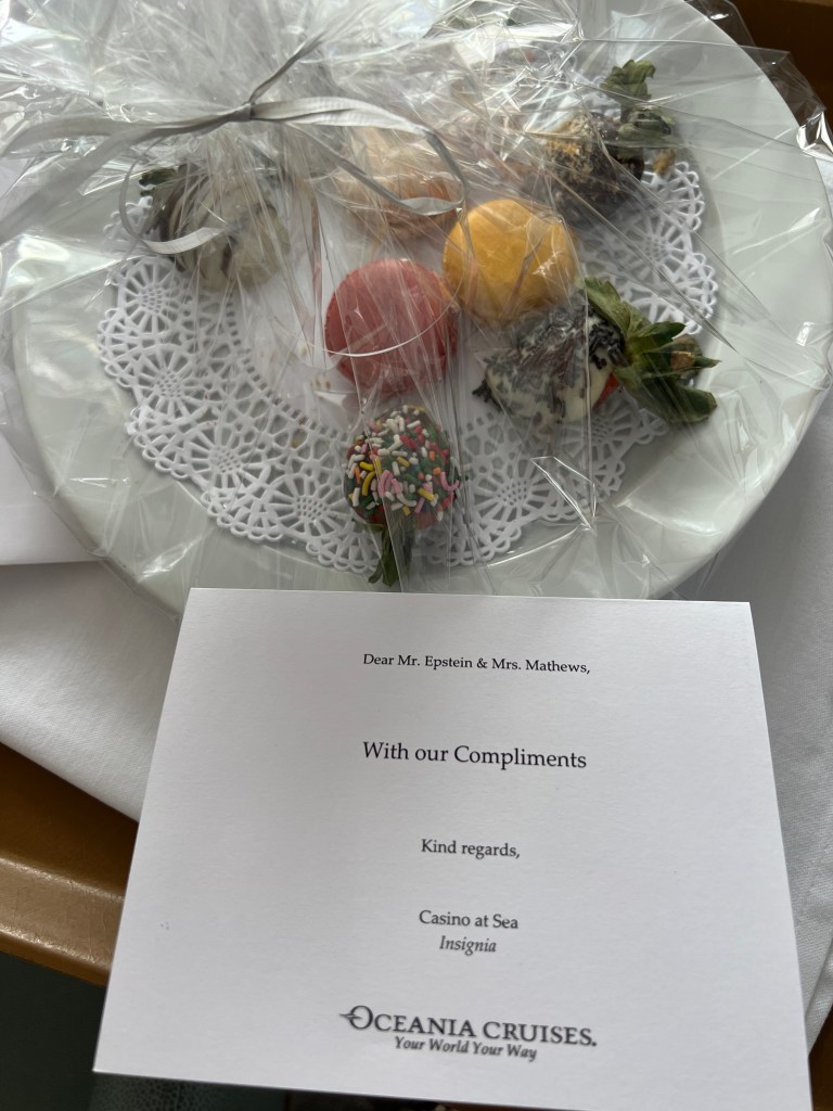 I had a nice surprise yesterday. There was a knock at our door and someone delivered a gift of chocolate covered strawberries and macarons. When I opened the card, I saw that the surprise was from the Casino team! I already ate a strawberry before I took the picture!