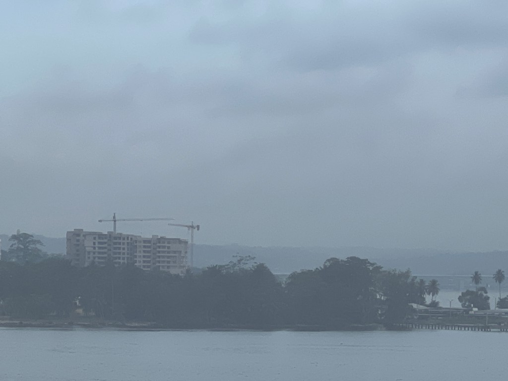 This is our second time visiting this country. This time, we had not booked an organized tour and intended to take the shuttle into town. But when we saw the pier with many police armed with AK47s and read the travel warnings, we opted to stay on the ship. Some friends took the shuttle and came right back. Most of the west African countries are about the same, generally nice and friendly people but an element of danger to tourists, lots of trash and air pollution. The air pollution was quite bad today. We both did our usual deck walks but decided to eat lunch inside instead out on the terrace which we usually prefer.
