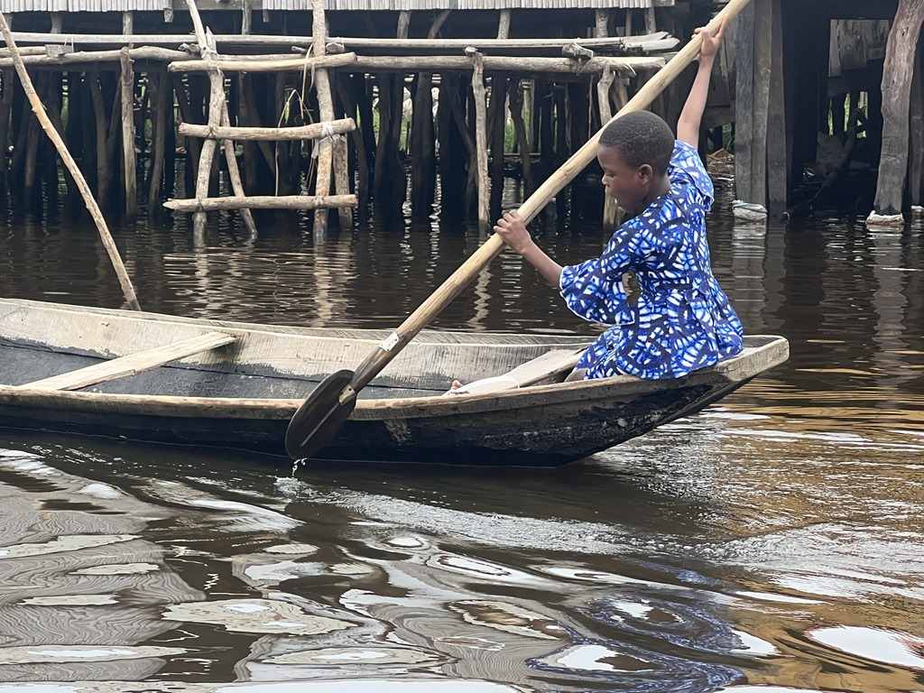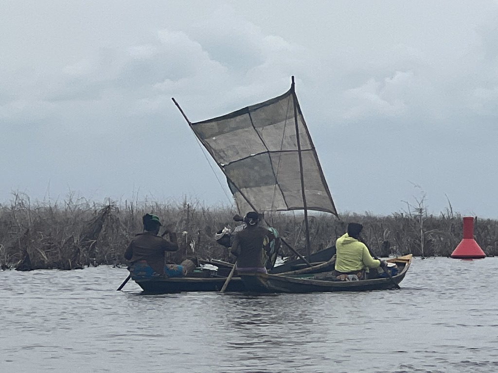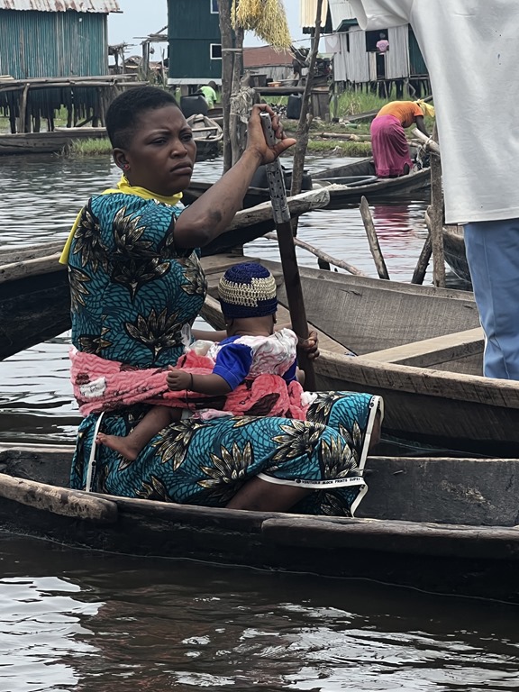 We saw people of all ages in small canoe like boats, some with makeshift sails, some with motors and some that were propelled by paddles.  We learned that each family in the village has three boats,  one for the children, one for the wife and one for the husband.