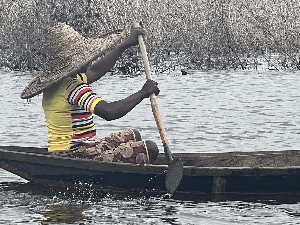 We then drove through the city and on to Aborney Calavi where we boarded boats that took us to the village on stilts.  Along the way, we saw many people fishing by casting large nets.  From time to time we saw small cages where the fish may be kept for several days.  There are other large areas that are lined with leaves that attract the fish.  Here, the fish might be growing for a year or more, and these are the ones that can be sold for more money.