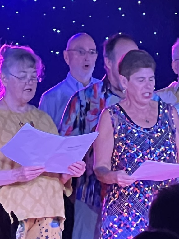 There is a “Sing Out Loud” group of passengers that practices on sea days, and last evening was their first performance. It was really wonderful. The group is made up of a lot of around the world cruisers but segment travelers can join too. It will continue practice and do several more concerts before we leave in July. Norm may decide to join. Our friend, Charlie, is in the group. Here are a picture of the whole group and one with Charlie in the middle.