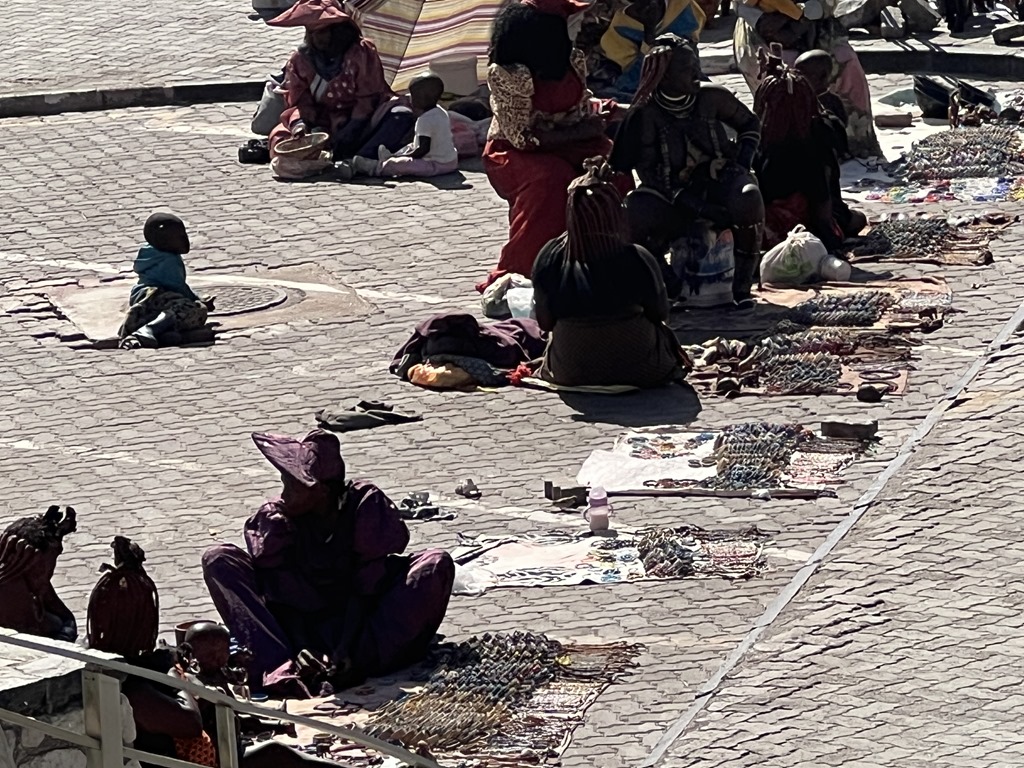 After that we went to the Swakopmund museum. We really enjoyed that too. The displays were nicely arranged and highlighted the history of the city. Here are a few pictures. The huge basket was used in the past to lower people off of boats. Looks dangerous to me! There were vendors set up along the street near and across from the museum. Eddie told us that these vendors are Himbas (related to the Massai) and that the women would be bare breasted. We saw many who were also nursing children. The Himbas were originally hired as housekeepers for the wealthy Germans. The men started to fool around with them, so the decision for the ones that wanted to keep their jobs was to wear German clothing including huge hats. The ones who wouldn’t wear the clothing stayed natural and bare breasted.