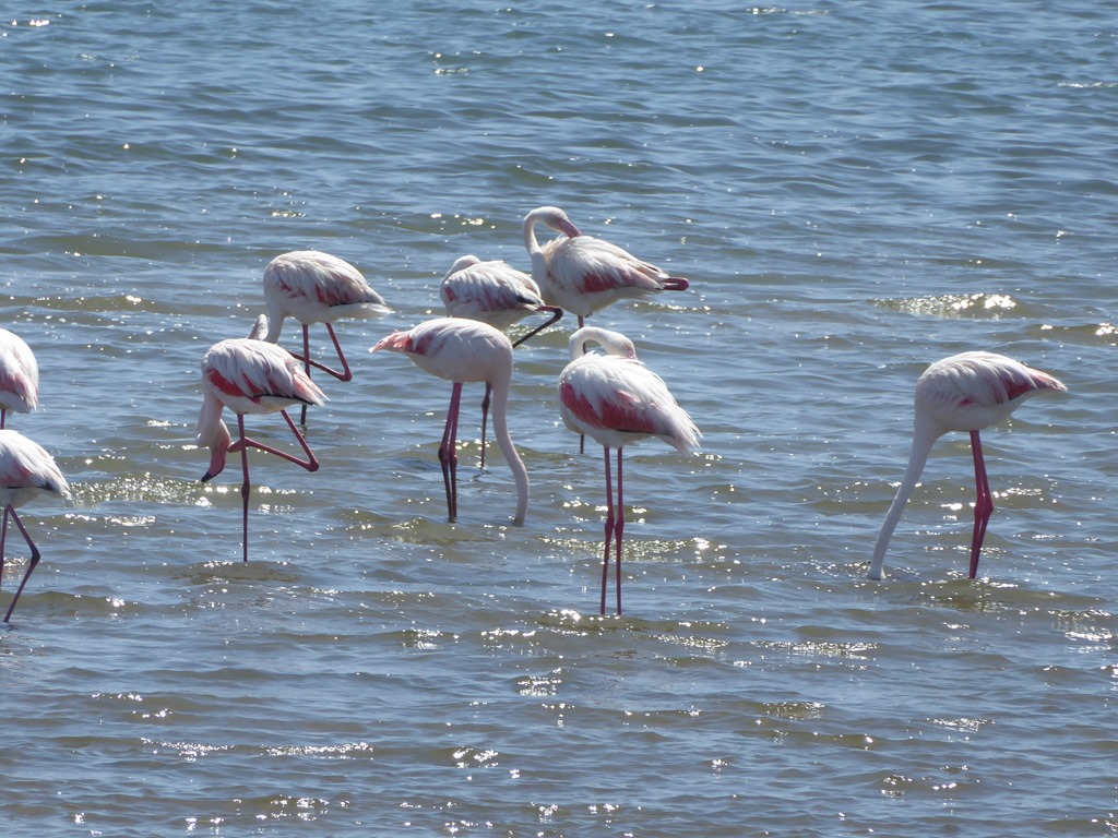 Our first stop was at the Walvis Bay Lagoon, home to many greater and lesser flamingos. Our friends in the trivia group on board told us that the name for a gathering of flamingos is called a flamboyance!