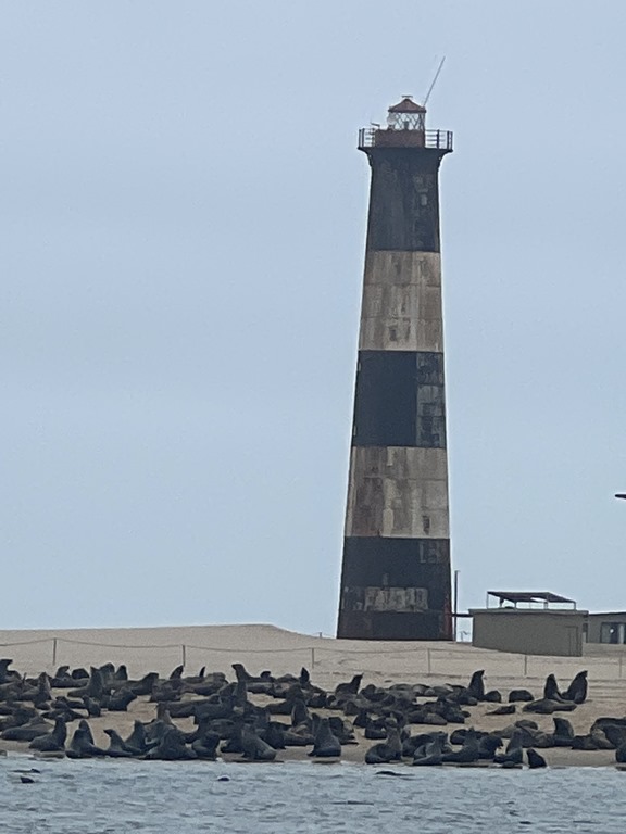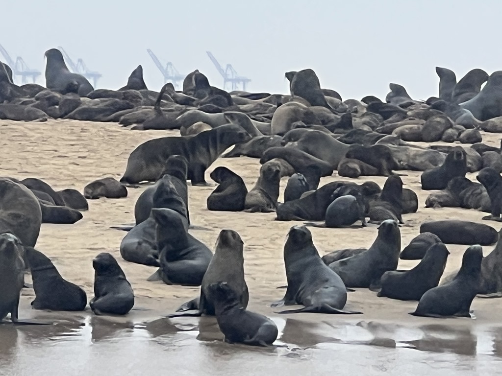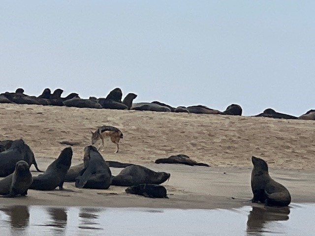 A bucket of fish immediately attracted many seals (these are fur seals – their ears are on the outside of their heads) and pelicans. They came right on and into the boat and we got amazing pictures. I probably have hundreds but won’t post them all! More than 3 million seals live here. We learned that the main predator for seals is surprisingly, the seagull. They pick on the weak or ill seals or the babies and they first peck their eyes out and then eat the rest. There are also jackals that attack the seals and we got to see one on the shore – in the first picture.