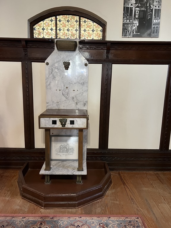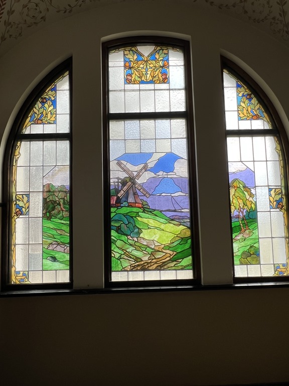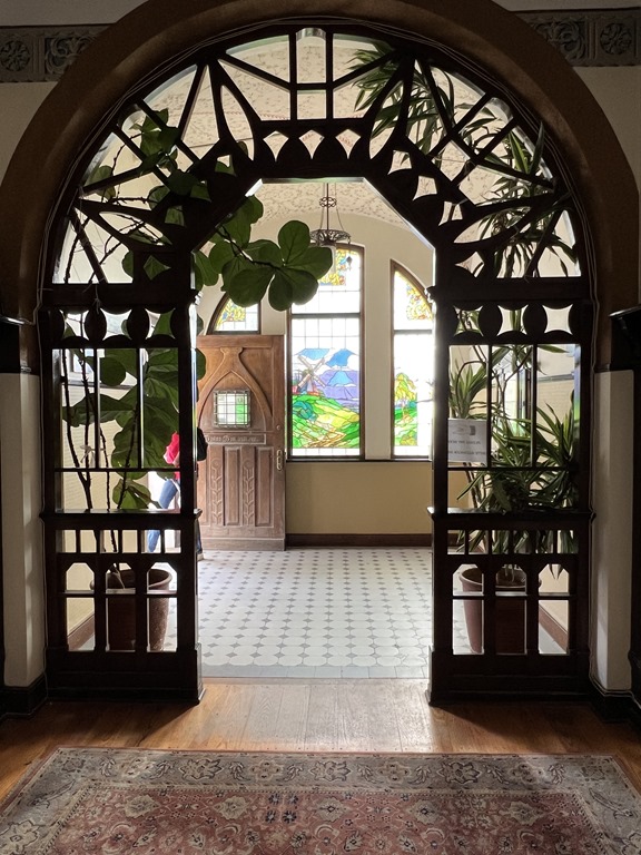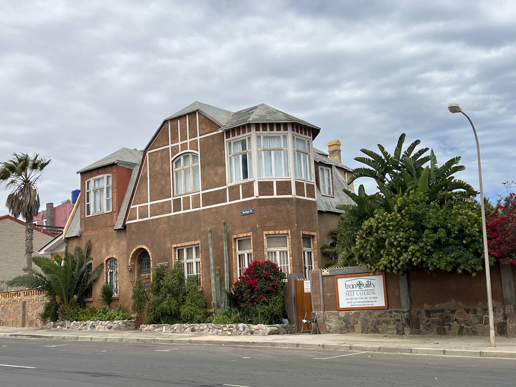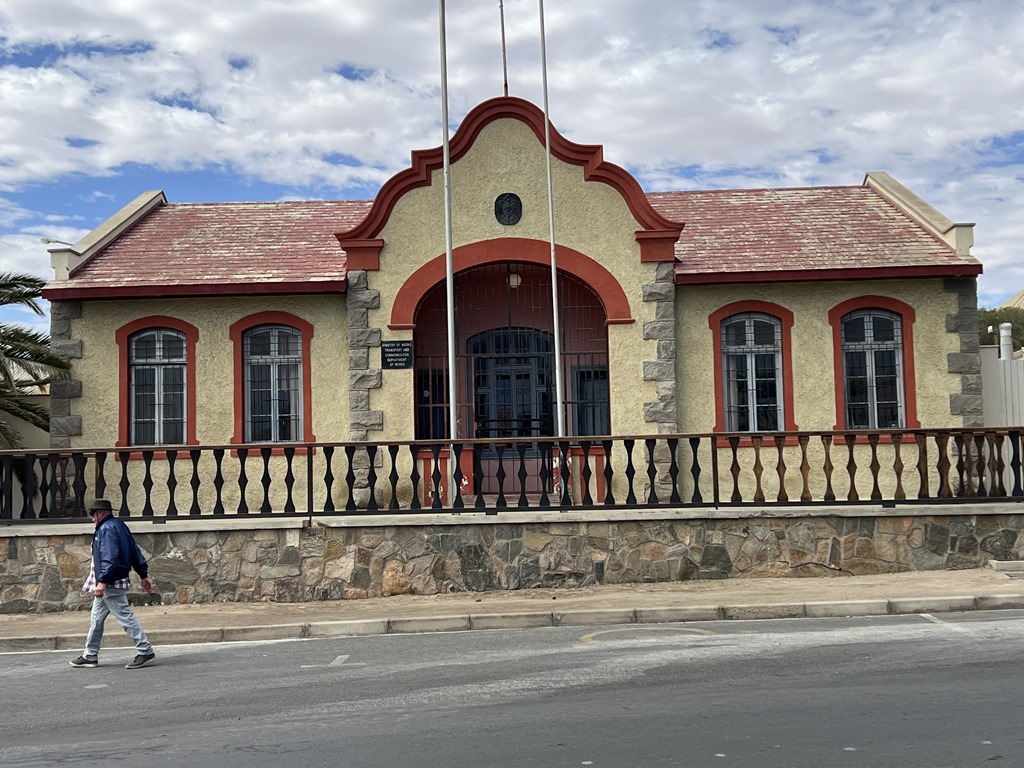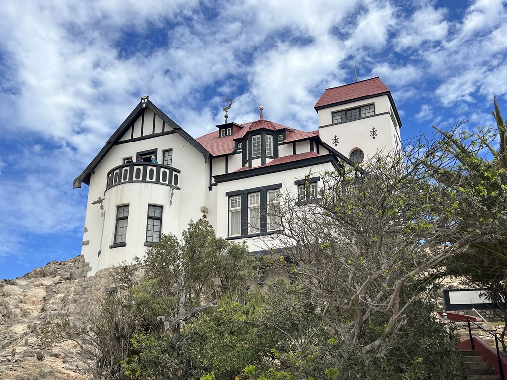 We walked uphill passing lots more colorful buildings to  reach the Goerke Haus. This was originally the home of Hans Goerke, the manager and co-owner of the German era diamond mining company.  It was constructed in 1910 at the top of Diamond Hill. The inside has elements of Art Nouveau design. It is one of the best preserved buildings in the town.