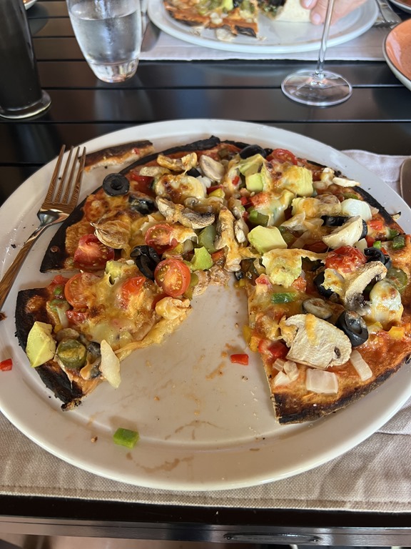 We arrived in time for lunch and to our surprise, it was “make your own pizza day”. We each got a pizza pan with a thin crust already on it, they added the sauce and there were at least 10 different toppings to choose from. They were cooked in the wood fired pizza oven – it only took about 5 minutes for each – and it was a delicious start to our stay here.![]()