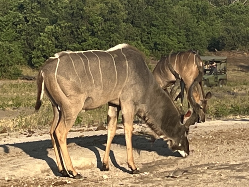 We met our guides at the airstrip and they drove us to the camp. Our guides were Innocent (for our vehicle) and Leonard for the other vehicle. Both were great and as knowledgeable as the ones we already miss. We had a drink and short orientation and our bags were taken to our rooms. These rooms were also wonderful – no individual small pools or outdoor shower, but otherwise almost the same. We had a nice front deck. One of the differences is that this camp is fenced so almost all the animals you see from your deck or the main building are outside the fence. We still need to be escorted to our rooms after dark, though, just in case there is an unexpected visitor.