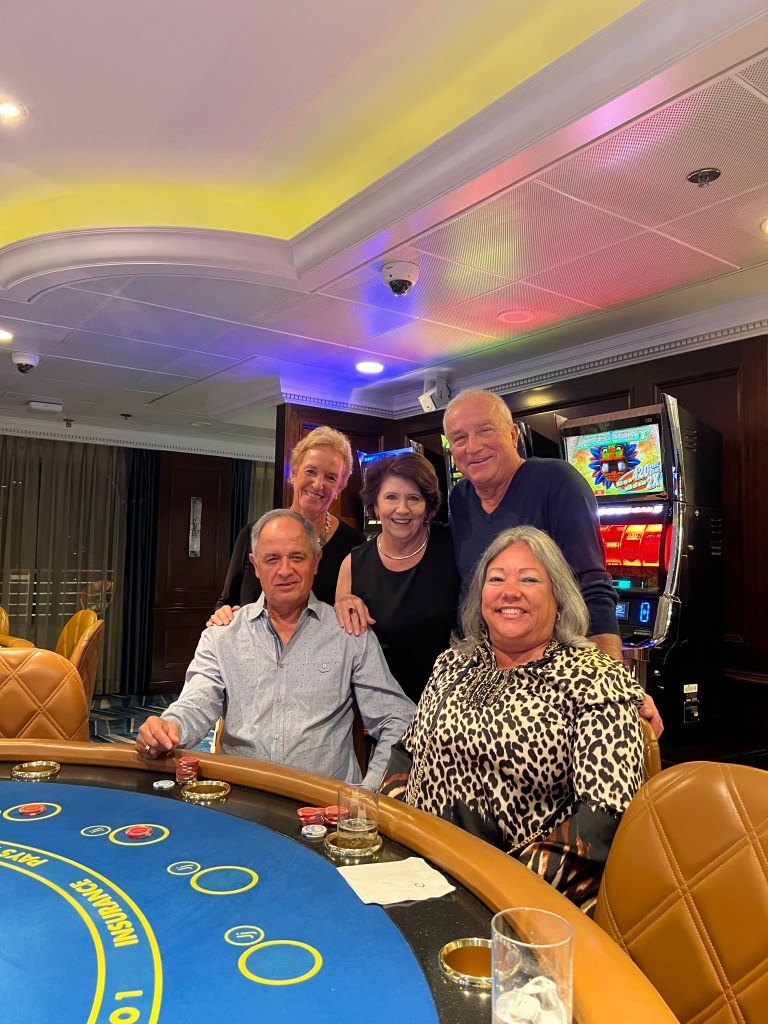 The night before we sailed into Dubai was the last night in the casino for one of our dealers, Jeannette, and the casino manager, Tony. I will miss them both. Here are pictures of Jeannette and one of a group of the “usual suspects” in the casino. The casino and the boutiques have to be closed when we are in port.