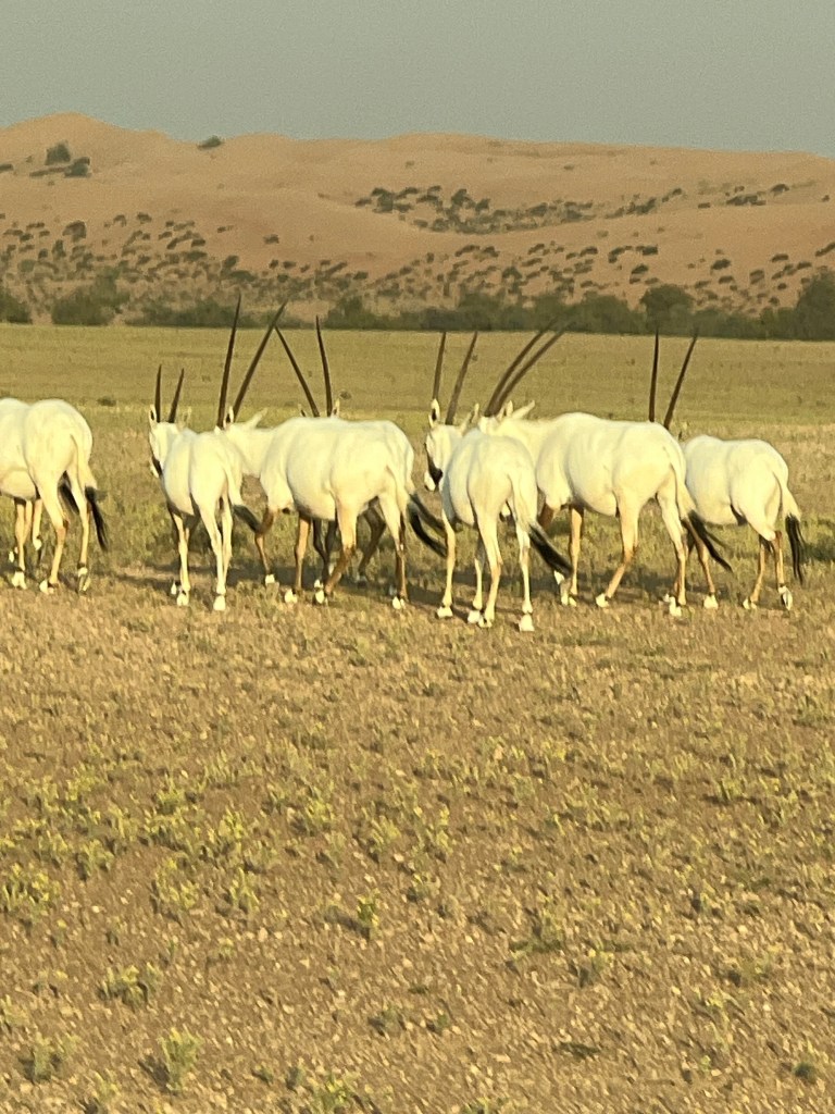 We had an Around the World special event this afternoon and evening – a vintage evening at Al Maha Desert Dune. To our surprise we were picked up in 4 wheel drive vehicles – only 4 to a vehicle. So that meant they needed 110 vehicles to bring all of the guests and the members of the staff who attended to the event. What a convoy that made on the highway! Only in Dubai. It took about an hour to reach the desert area and all of the vehicles had to let some air out of the tires as we drove through sand. These same vehicles are used for the dune climbing which we have done in the past, so they are equipped with roll bars, etc. As we entered into the Dubai Desert Conservation Reserve, we spotted impalas and a large group of white oryx.