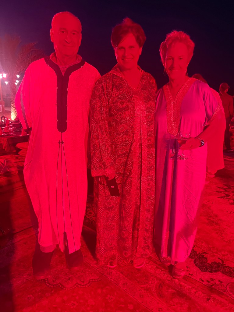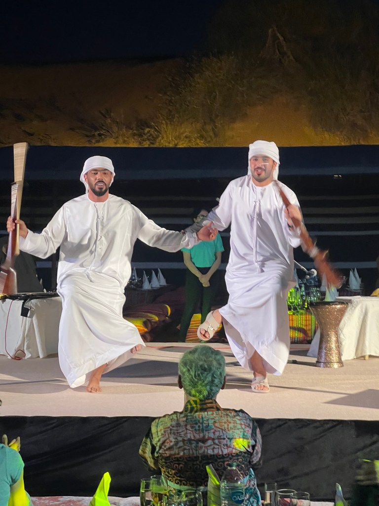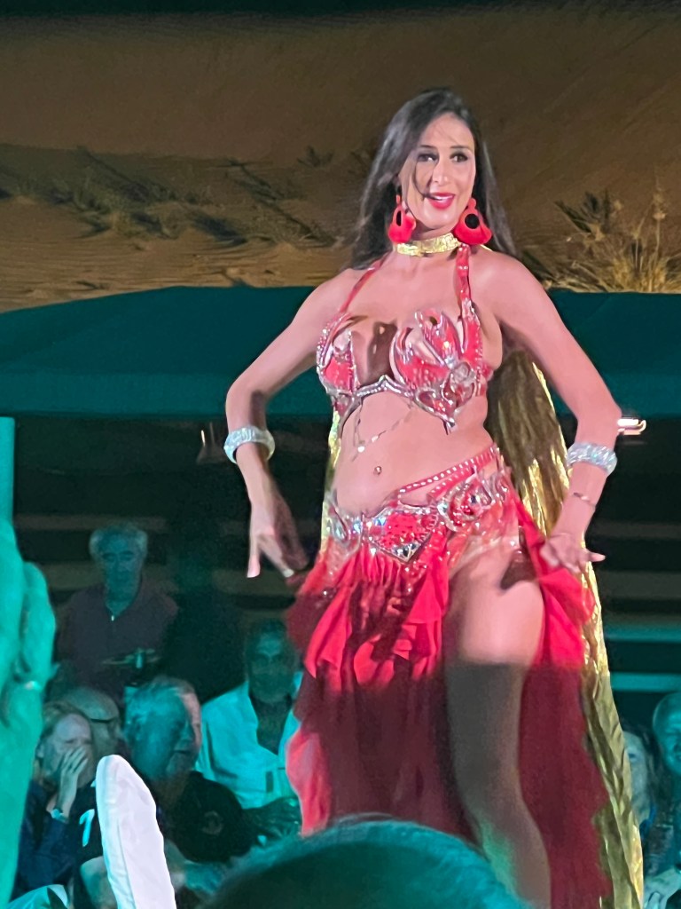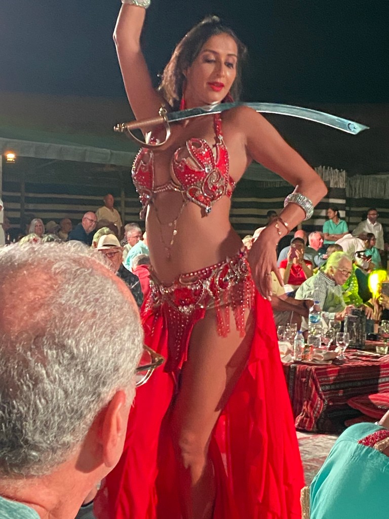 We had middle eastern appetizers at our tables and a buffet dinner under the stars. It was catered by the Al Maha Luxury Resort and Spa which is owned by the same people as Emirates Airlines. Drinks and food were plentiful and those who ate meat had all types of fresh grilled kebabs.
