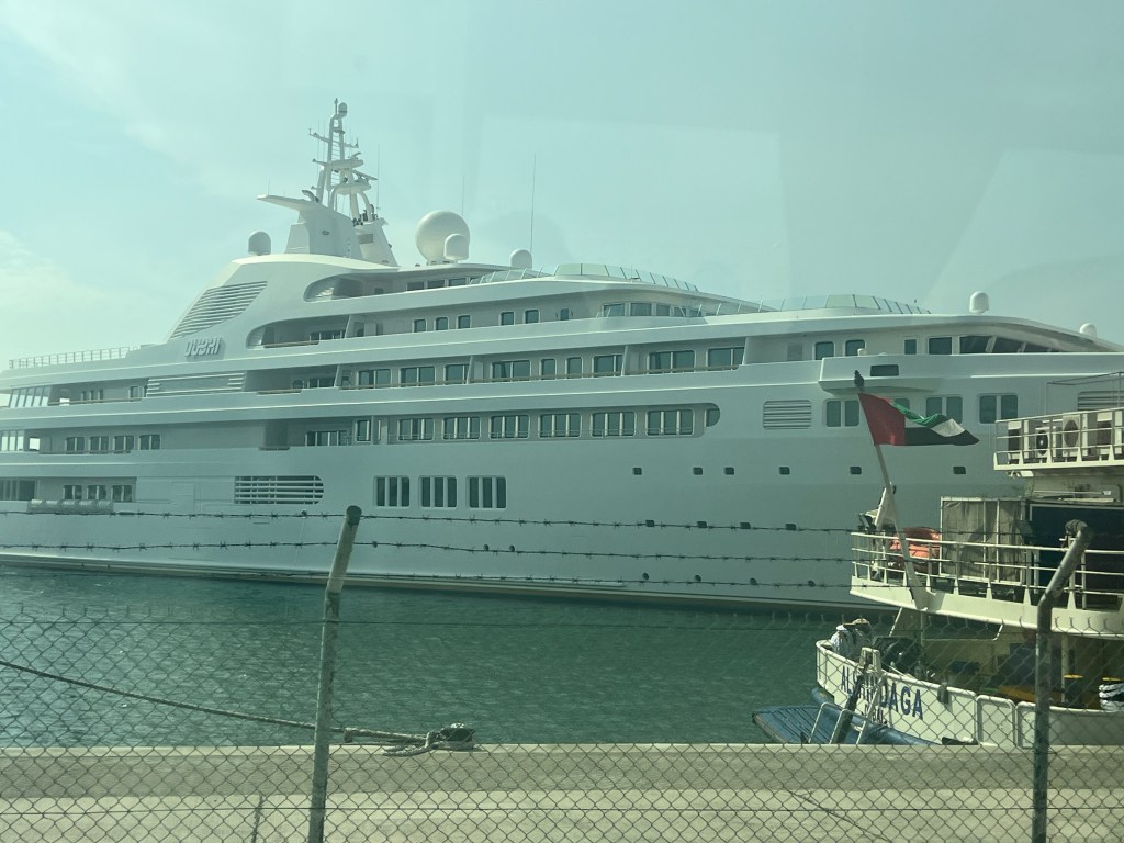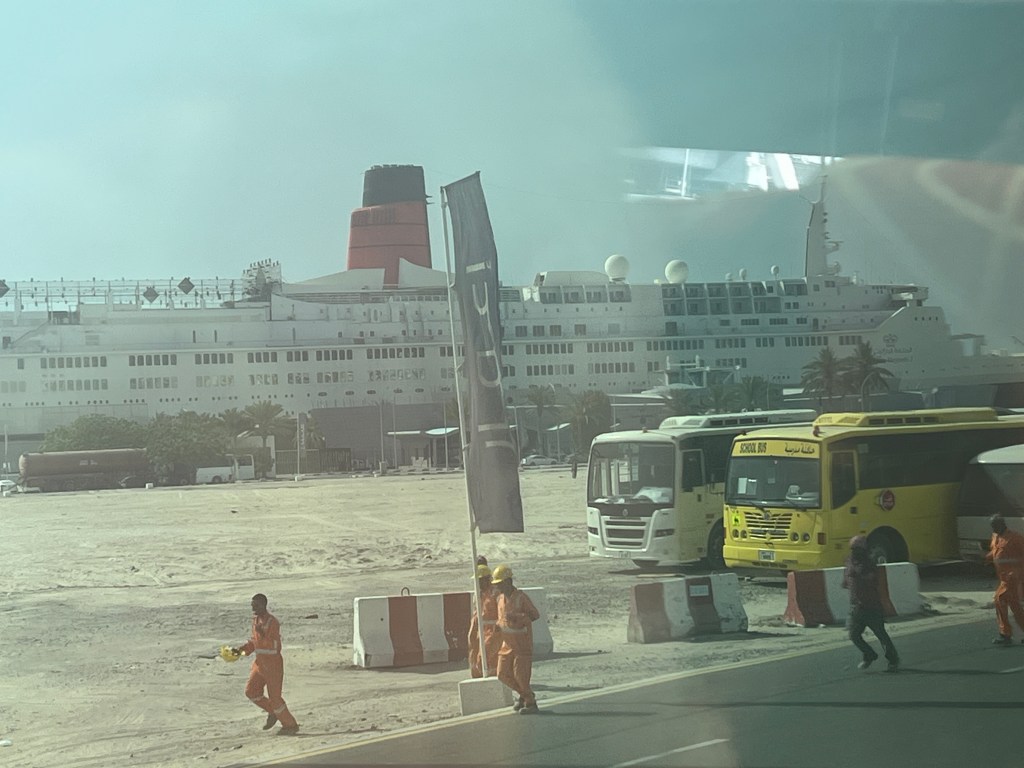 We arrived in Dubai about 1 PM on Tuesday, April 25. Here are some pictures of the pilot arriving and of the sights when we arrived at the port. The tall building is the Burj Khalifa, the tallest building in the world. We have visited it twice before so won’t go up this time. Note the pollution in the air – it is almost always this way, but we did have a pretty nice view on our first visit in 2015.