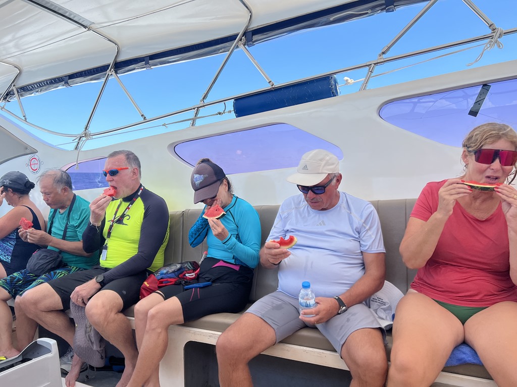 On the way back, Hadi and the crew served us cold fresh watermelon and pineapple and it was delicious! They also kept us hydrated with cold water and Cokes all day long. Here are some of our fellow snorkelers enjoying the watermelon.