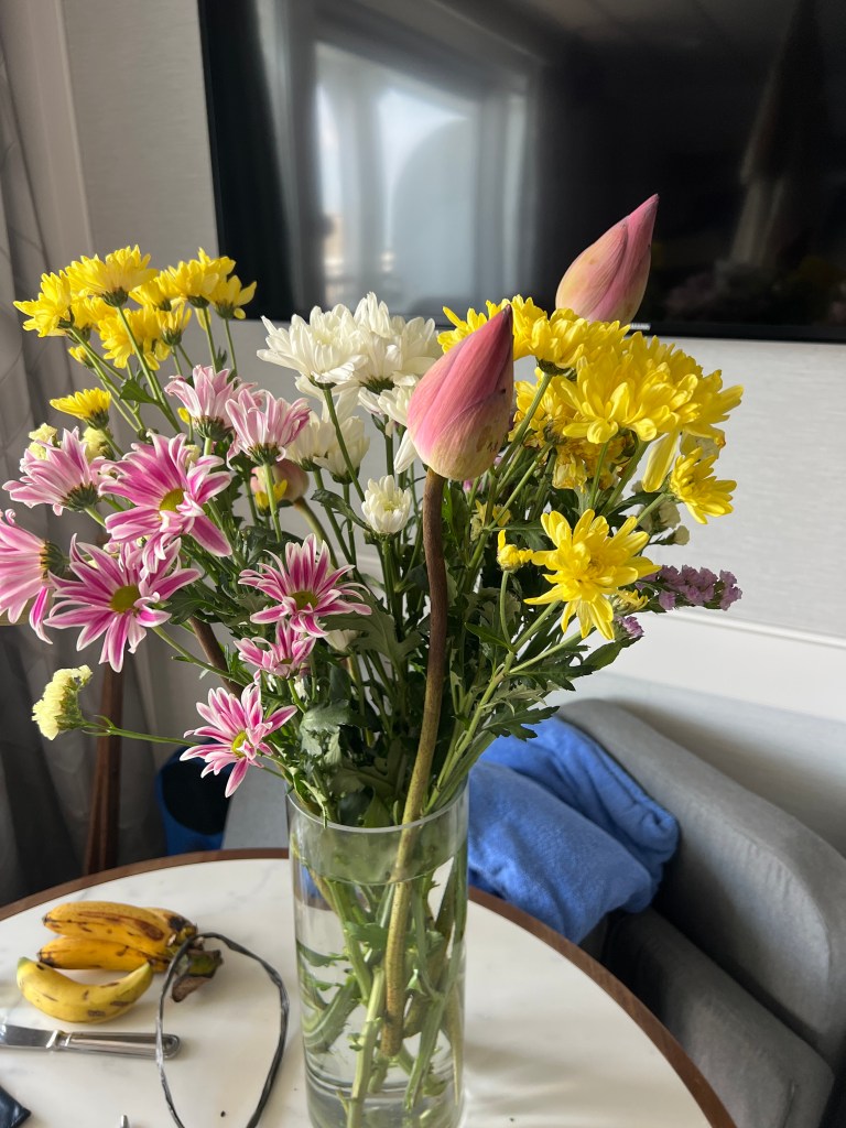 It was again a very hot, steamy day, so we decided to go back to the ship in time for lunch. This is when we discovered that the CAT bus had a mask requirement, so we grabbed a taxi, again for $5. I spotted a flower market on the way back to the ship and asked the taxi driver to stop. It is the day after Mother’s Day and the day before our 41st anniversary, so flowers were definitely required! I picked out a lovely bouquet for US $8.