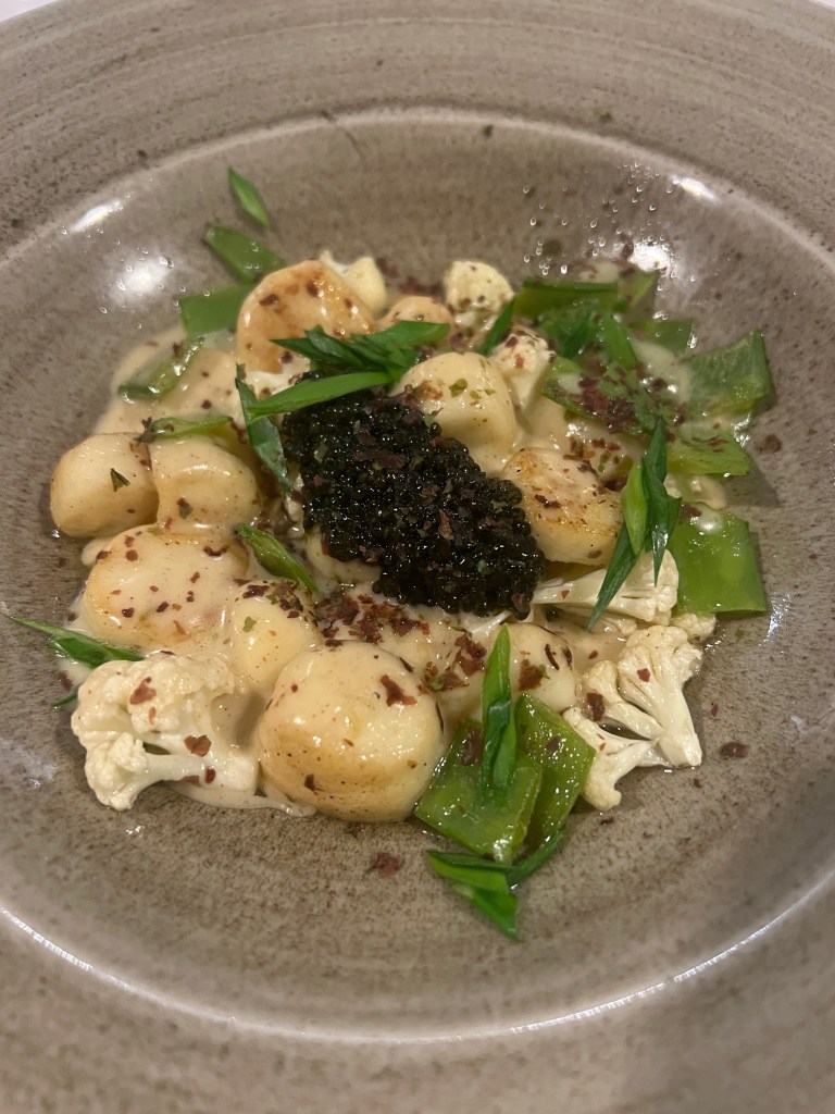 Fiirst was the Scallop Gnocchi with Kombu, Sage and Cauliflower. David also added sugar snap peas. This is gnocchi made with blended scallops and made to look like the actual scallop. They make many gluten free, vegan and other special dishes in their restaurants which he said is almost unheard of in France – that in the US there are so many dietary issues and allergies. It forces him to be a more creative chef, he said.