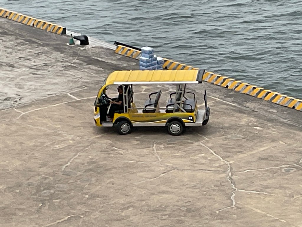 We got a cab out on the street after taking an electric cart to the port entrance. We can walk in the port since it is not a commercial port (that is in another location), but it is almost a mile out to the street. When we were here in 2017, we were anchored and had to take the tender to shore. I am not sure if that was because another ship was at the dock or if the dock wasn’t completed then.