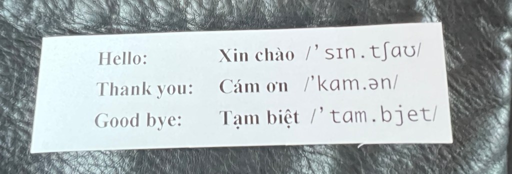 When it was time for the trip to the Around the World event, we were taken by bus and our guide on the bus had a long Vietnamese name. So he told us to call him Steven, his name in English. He gave us a lot of information about Ha Long Bay and even a print out of three common sayings.