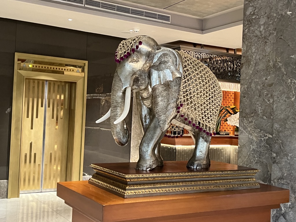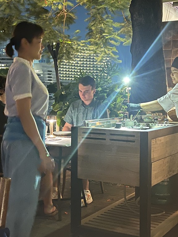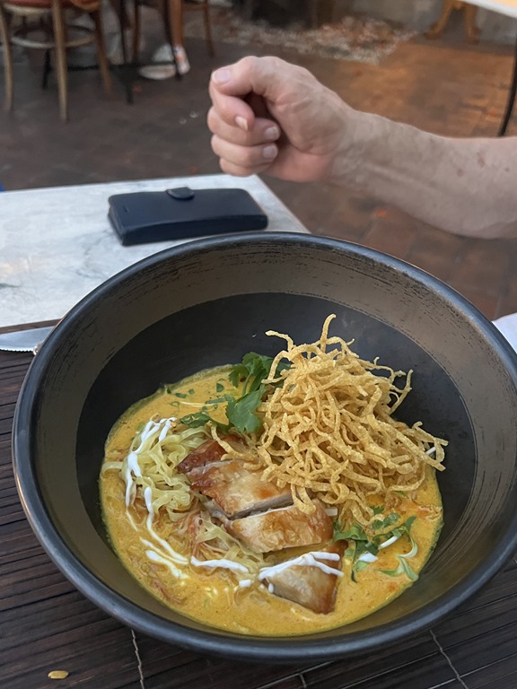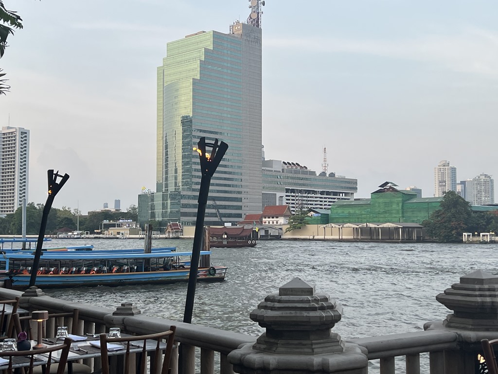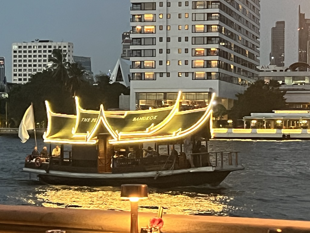 The dining area on the river was lovely but we found out that after 6:30 Norm could not go in wearing shorts. They do have trousers for patrons but they are made for Asian bodies, not “European” as they say there. Dress codes can be strict, no sleeveless tops, no flip flops, etc. So we took the river taxi across the river to the Peninsula Hotel and had dinner at their Thai restaurant also outside on the banks of the river. It was beautiful and delicious.