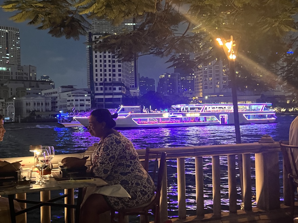 We wanted to go out to dinner near the river, so we asked if we could just stay with our tuk tuk instead of going back to the ship and Gina arranged it with our driver. We went to the Mandarin Oriental Hotel which was absolutely beautiful. It was quite a distance from the coffee shop to that part of the city, and interesting to do it by tuk tuk.