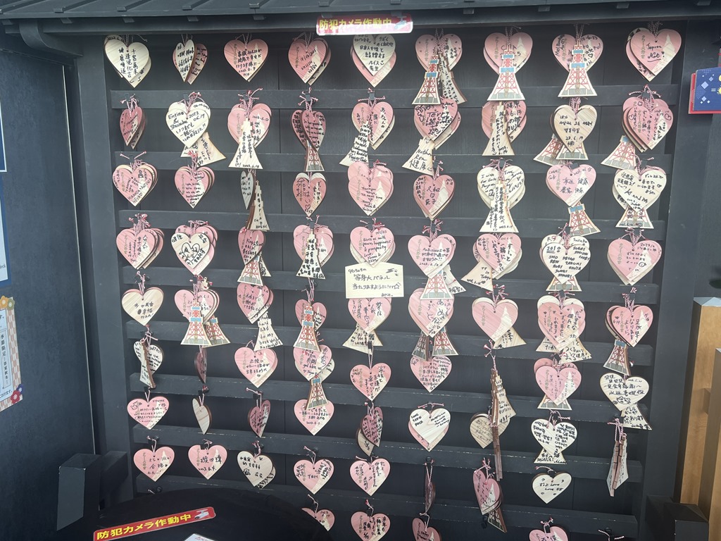 These are wooden hearts and towers that people write their wishes on and hang on this board. You see these in many places.