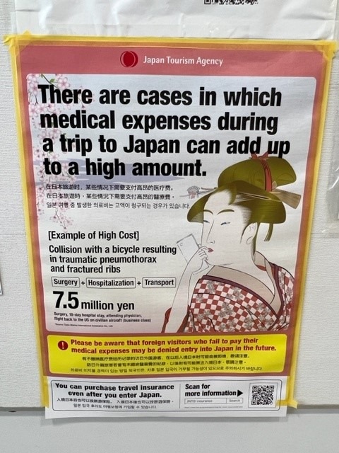 In every city we see this poster that warns you, as a foreign tourist, about the high cost of Japan’s medical system of you have an accident or need care. They are in the train stations and cruise terminals.