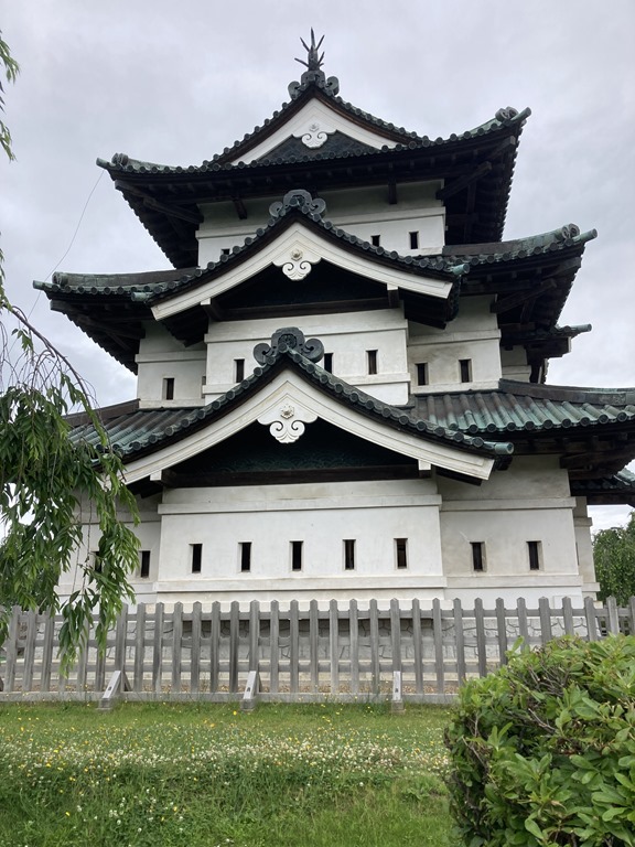 Today we had a tour to Neputa Village and Hirosaki Castle. Our guide was Tomohiko and he asked us to call him “Tom”. Here he is showing us his uniform. He told us he was born in 1955 and is retired from hi s job but is now trained as a tour guide. He told us that 90% of the people who live in this city are native to here. Trading, banking and agriculture are the main occupations. We are on the northernmost island in Japan now and it is cold in the winter, they get 1 – 2 meters of snow each year. The water and the rice are excellent so there are many sake breweries. During the cherry blossom season they get 3 – 4 million visitors for the one week festival. They are also the biggest producer of Fuji apples in Japan. More than half of the 760,000 ton crop is raised here.There are 50 apple pie restaurants and you see apple everything!