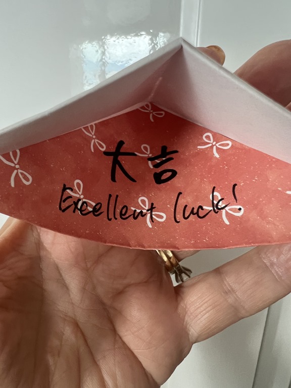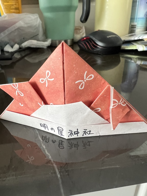 Here is our view when we sailed into port at around 9 AM. We were met by local people who gave us these origami figures with sayings inside. Mine said “excellent luck”. And indeed, we are lucky to be in this beautiful port.