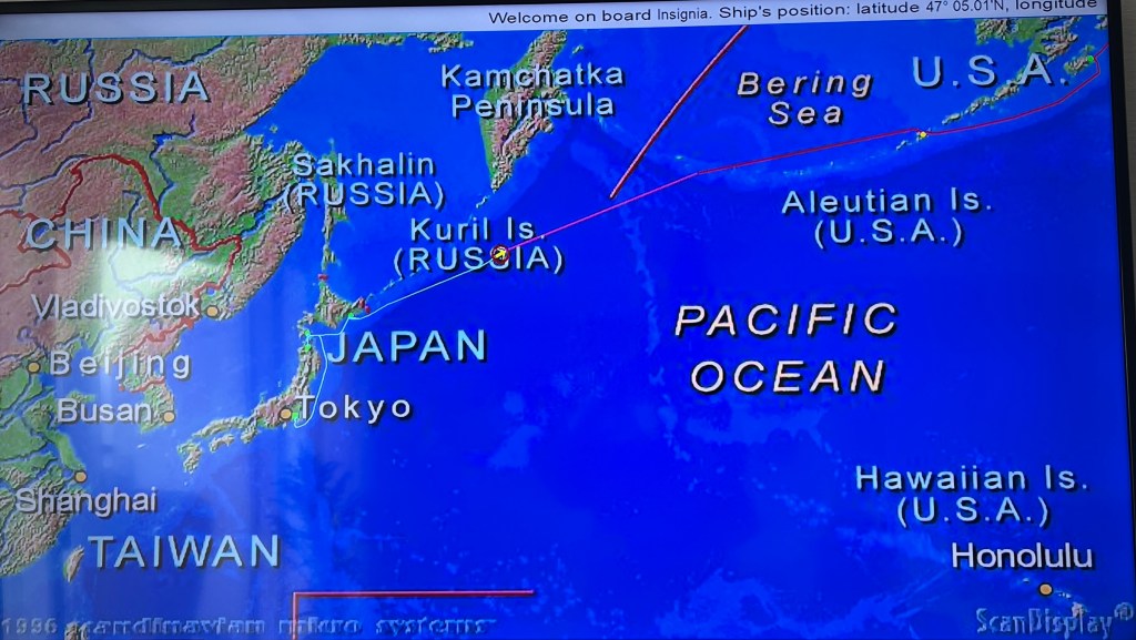 Yes, the dates are correct. We are in a 5 day Pacific crossing from Japan to Alaska. And we had an extra Wednesday, June 28 because we crossed the International Date Line. This wouldn’t be so strange before we had all of these electronic devices that just don’t coordinate with an extra day, let alone losing an hour 6 times and 2 hours one time. We will arrive in Dutch Harbor Alaska tomorrow, June 30 and after that we will just lose one more hour before heading down the coast to San Francisco.