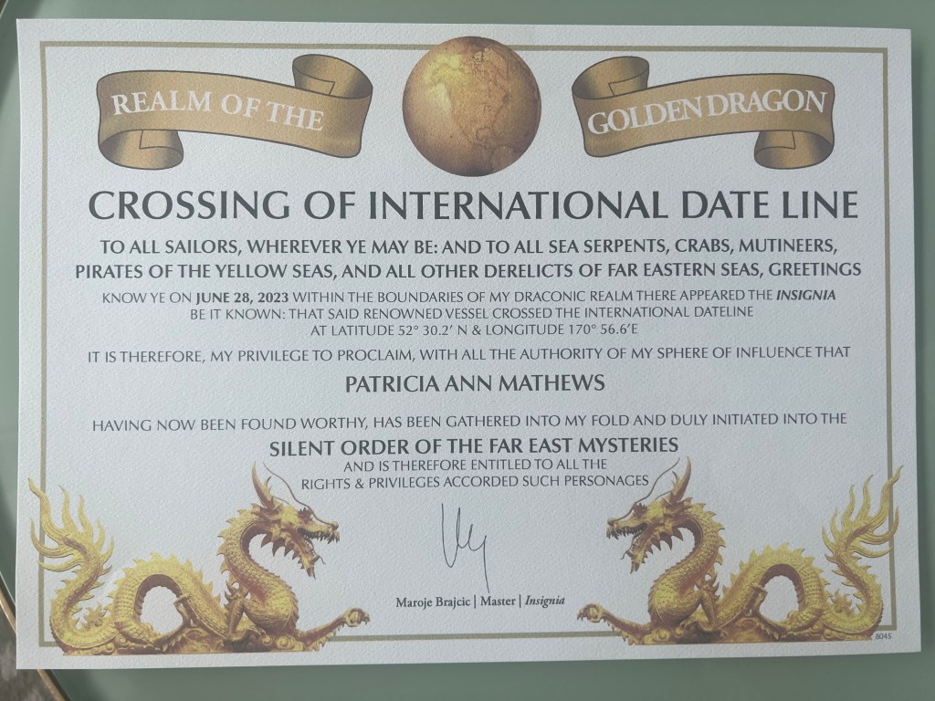 So, what do we do to stay busy on so many sea days in a row? I won the blackjack tournament twice, I am doing some art projects (photos later when they are complete), I watched a movie, attended a cooking demonstration, listened to lectures, ate at an Around the World Brunch, attended a cabaret show starring Paul and Carolyn – our around the world ambassadors, attended a show by Abby – one of our entertainment team, attended an auction of 3 sets of the ship’s charts (there were three and one brought in $1500) and bid on the opportunity to be cruise director for the day and the opportunity to bid on dinners with the crew members of your choice. The auction raised over $8000 and it is all for the crew welfare fund which provides shore excursions, prizes for crew games and activities and whatever else is part of the appreciation we have for this amazing crew. I also did some reading and generally relaxed. No time to get bored. It is only 45 degrees F and somewhat overcast and rainy. The seas have been pretty calm the whole way. We are so far north that it stays light until almost midnight!