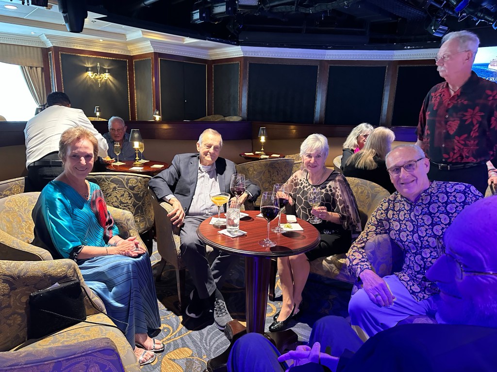 Last night we had the first of the two Oceania Club cocktail parties that we are invited to during every segment. They need to have two because out of the 560+ passengers, only 50 have not sailed with Oceania before and these parties are for returning guests. The Oceania lounge can only hold about half of the guests for the party. Because we are at the level we have achieved for so many cruise credits, we are always invited to both.