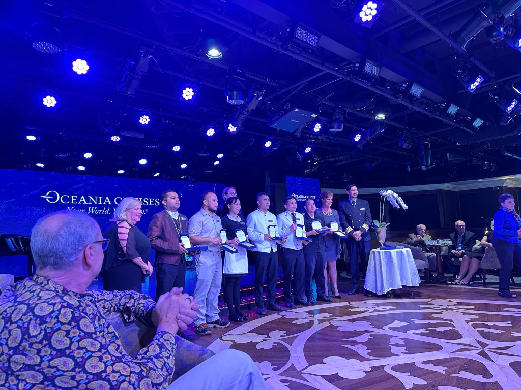 Here are some pictures of the party. One of the things we really like is when crew members receive their longevity awards in front of the guests. And when guests achieve another level, they are presented with their pins. We received our President’s Circle pins earlier in the cruise.
