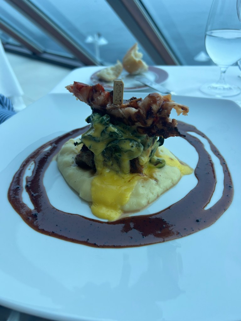 We also got the word from the Captain that we were going to miss the stop in Kodiak, Alaska due to bad weather. The waves were 15 feet and the ship was the rockiest it has been the whole cruise. So the ship has to go slower and we wouldn’t get to the port in time. We have never been to Kodiak so it will have to wait until next time. The rocking was not bad for us but many passengers felt the effects. We had an Oceania Club cocktail party which was attended by fewer than usual, followed by dinner in Polo. Two of our singers, Laura and Robbie, performed at the cocktail party but our main show by Sonia Selbie, was postponed until July 2 and there was a movie instead. In Polo, Norm had this amazing veal oscar.