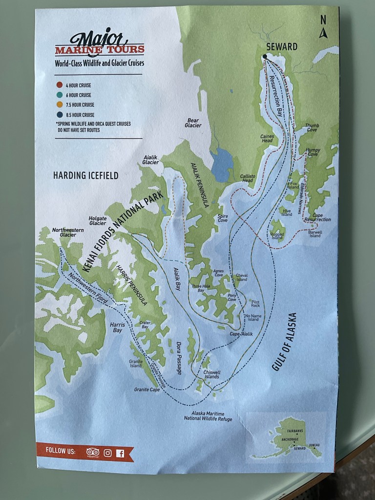 Seward is located on Resurrection Bay on Alaska’s southern coast about 120 miles from Anchorage. The town has only 2717 people according to the 2020 census. It is named for former United States Secretary of State William Seward who orchestrated the US purchase of Alaska from the Russian Empire in 1867. The cost to the US was less than 2 cents/acre. At the time, the purchase was seen as foolish – Seward’s Folly.