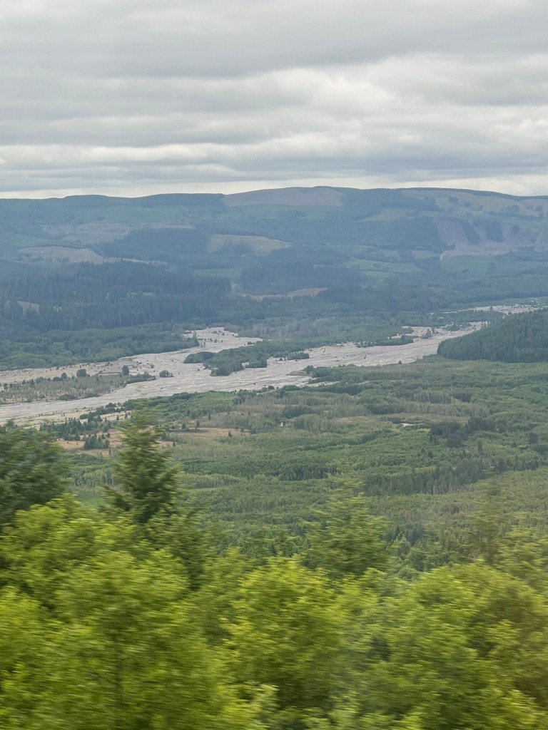 We traveled on Route 30 (yes, it runs from NJ all the way out here to Oregon) until we reached Route 5 and then the road to Mount St. Helens. The Johnson Ridge observatory is closed through 2023 due to a mudslide that is still being cleared but the Coldwater Lake science and learning center remains open.