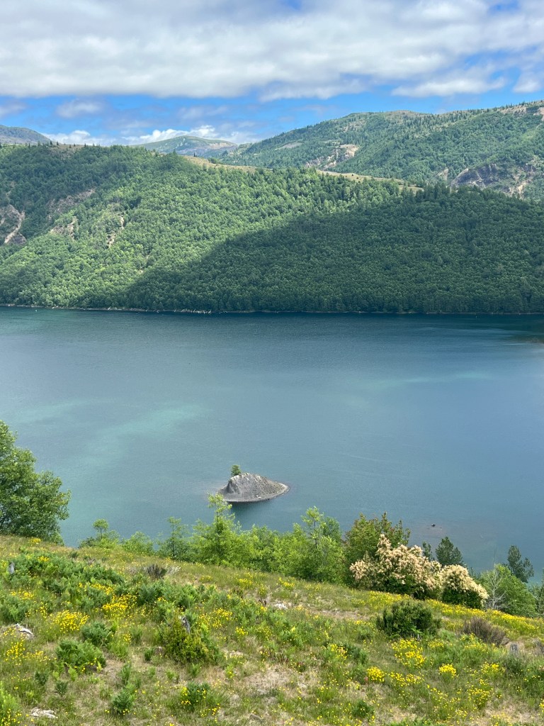 It is hard to believe that in only 43 years since the largest historical landslide on earth and a powerful explosive eruption causing more than 150 square miles to be flattened – the area is so tree covered and green. As the literature from the learning states “The lesson is that life is resilient and ongoing.” The movie showed the story of some of the survivors as well as showing dramatic footage of trees and logs blocking the river and the volcanic mudflows that choked the rivers. The landslide deposit – its surface strewn with huge blocks of shattered rock called hummocks – buried the river valley as much as 600 feet deep for a distance of 13 miles. The violent eruption killed 57 people and destroyed every building except one in its path. The surviving building still stands but we went by too fast to get a photo of it.