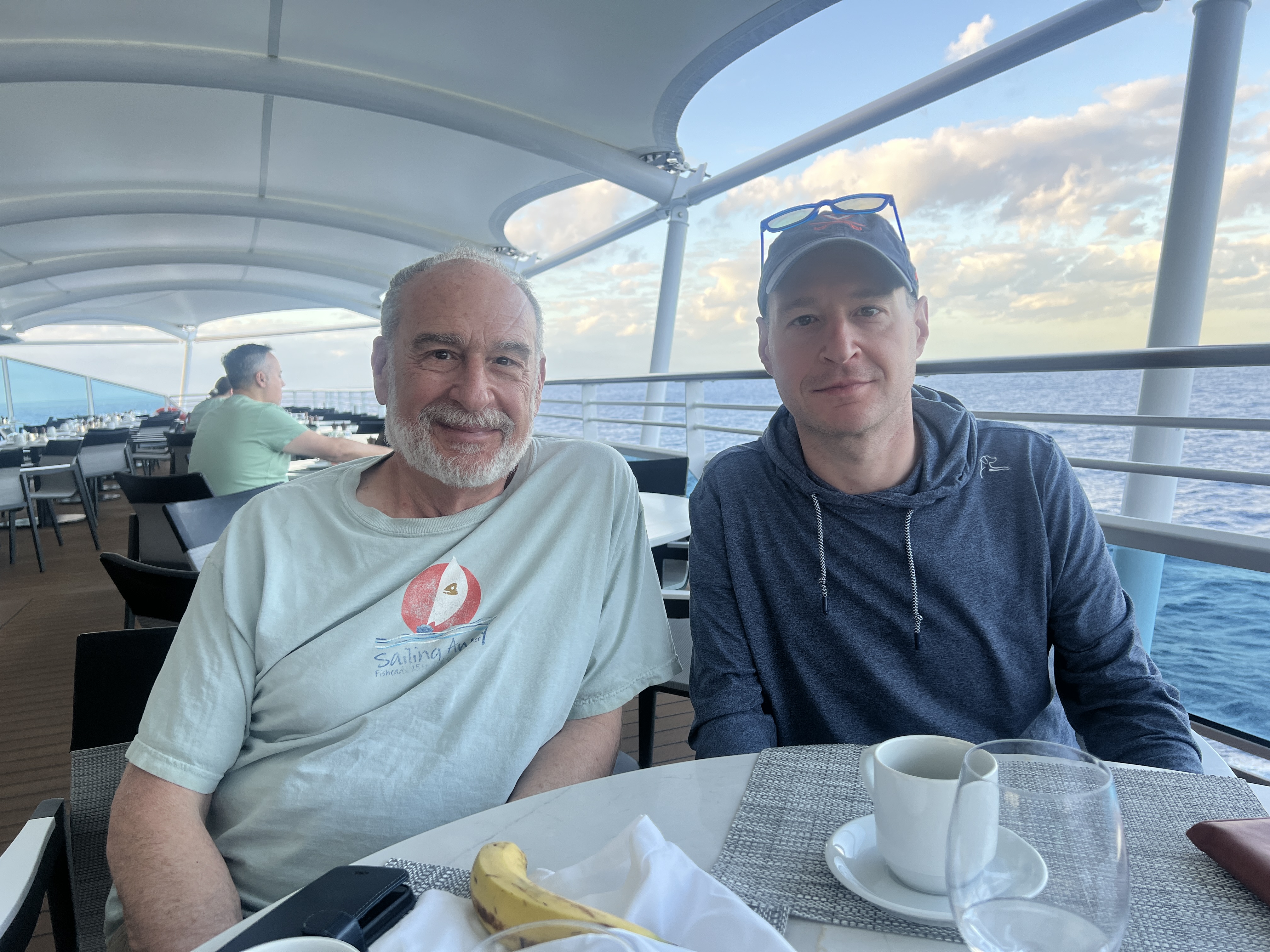 Nice picture of Norm and Adam after breakfast at the Terrace Cafe. For my fellow Oceania travelers who read the blog, the outdoor part of the Terrace Cafe on other ships has tables with umbrellas. Here, they have a covering over the whole area which is really a good idea. We love eating out here.
