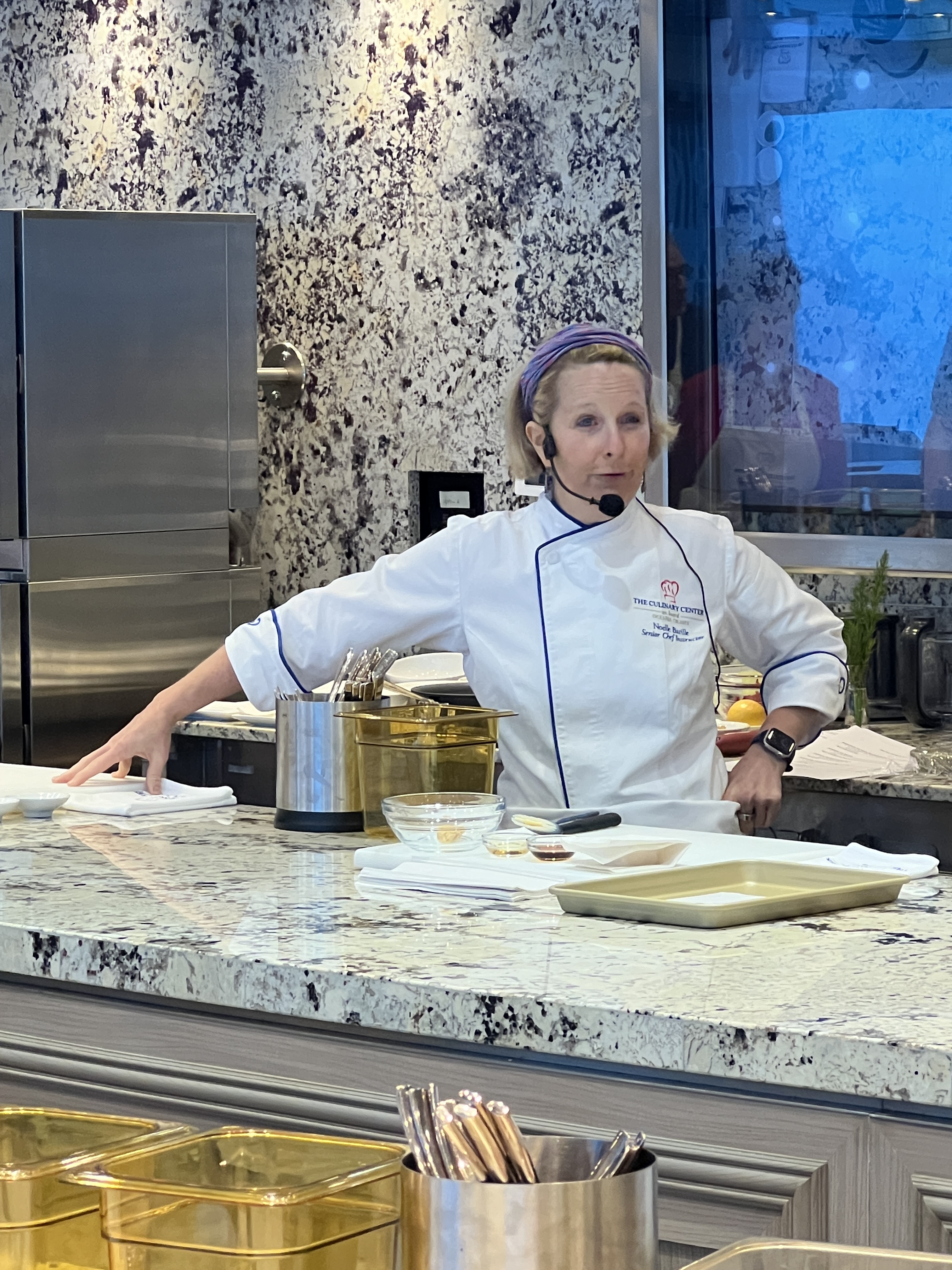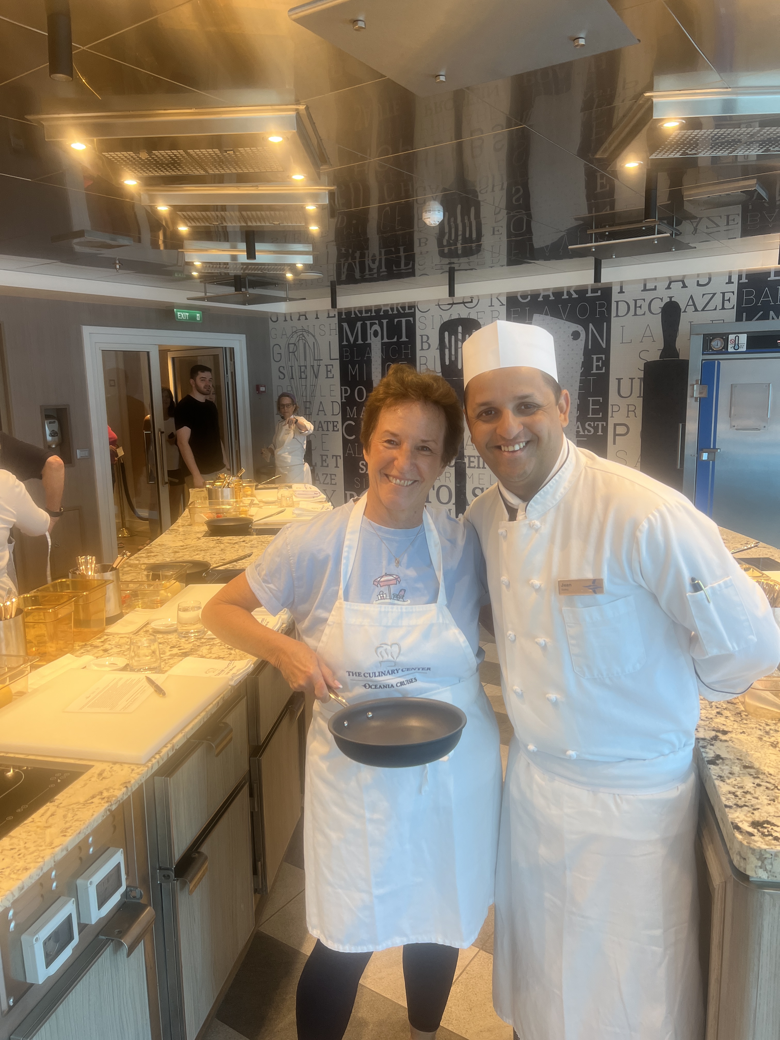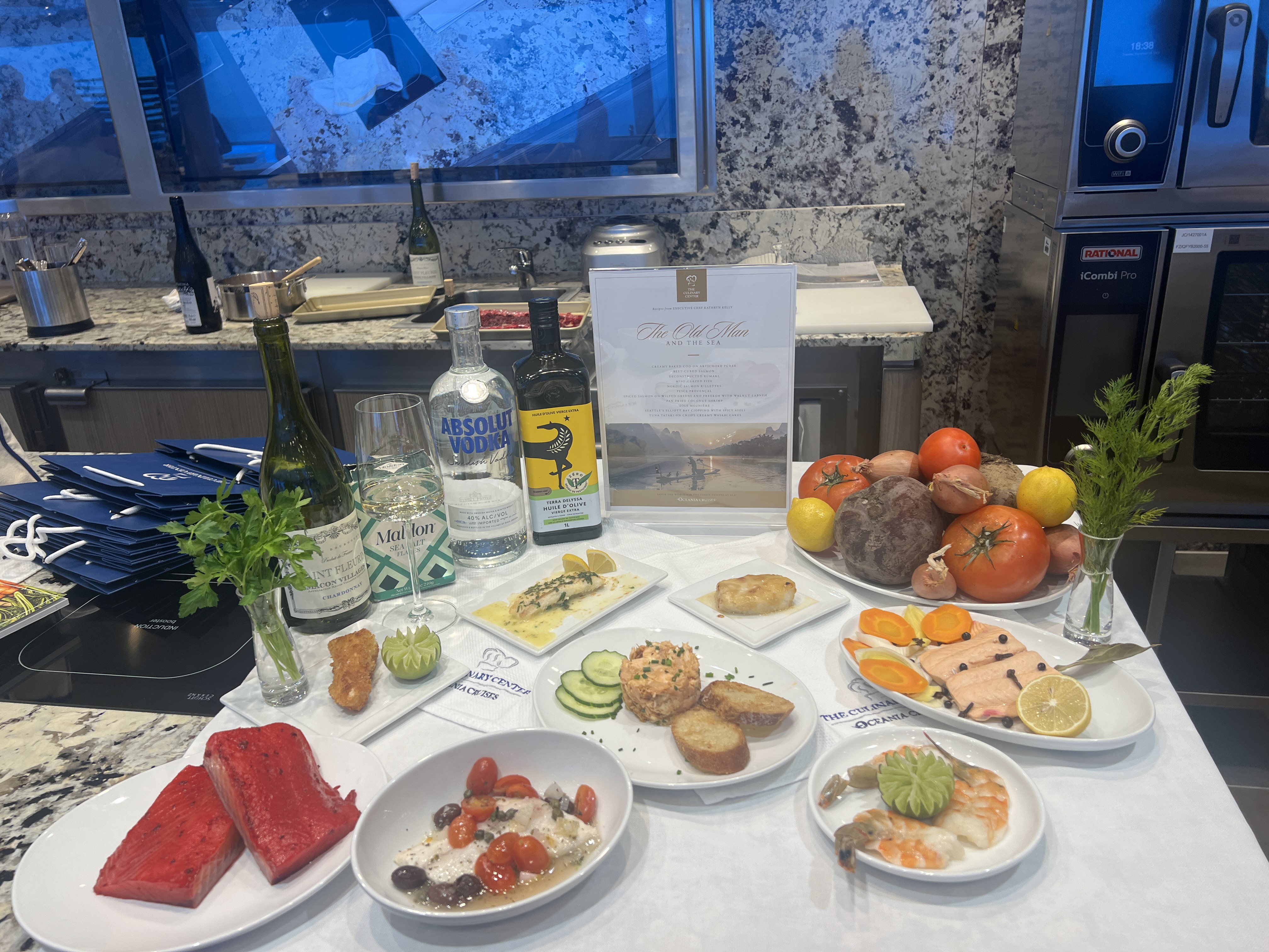 It was a nice day, not too hot, and we all had different things to do. After breakfast, I had a 2 hour cooking class called “The Old Man and the Sea” which of course focused on seafood preparation. Our instructor was Noelle. I took a class with her on the Marina cruise a few years ago. She not only taught the recipes which we then cooked, she talked about wine pairings (we had 2 kinds of wine) and she challenged us to try different methods of cooking fish. The culinary center is really beautiful and all of the staff makes it easy to prepare the recipes. The center accommodates 24 people and the classes fill up. This one is the most popular one, Noelle said.