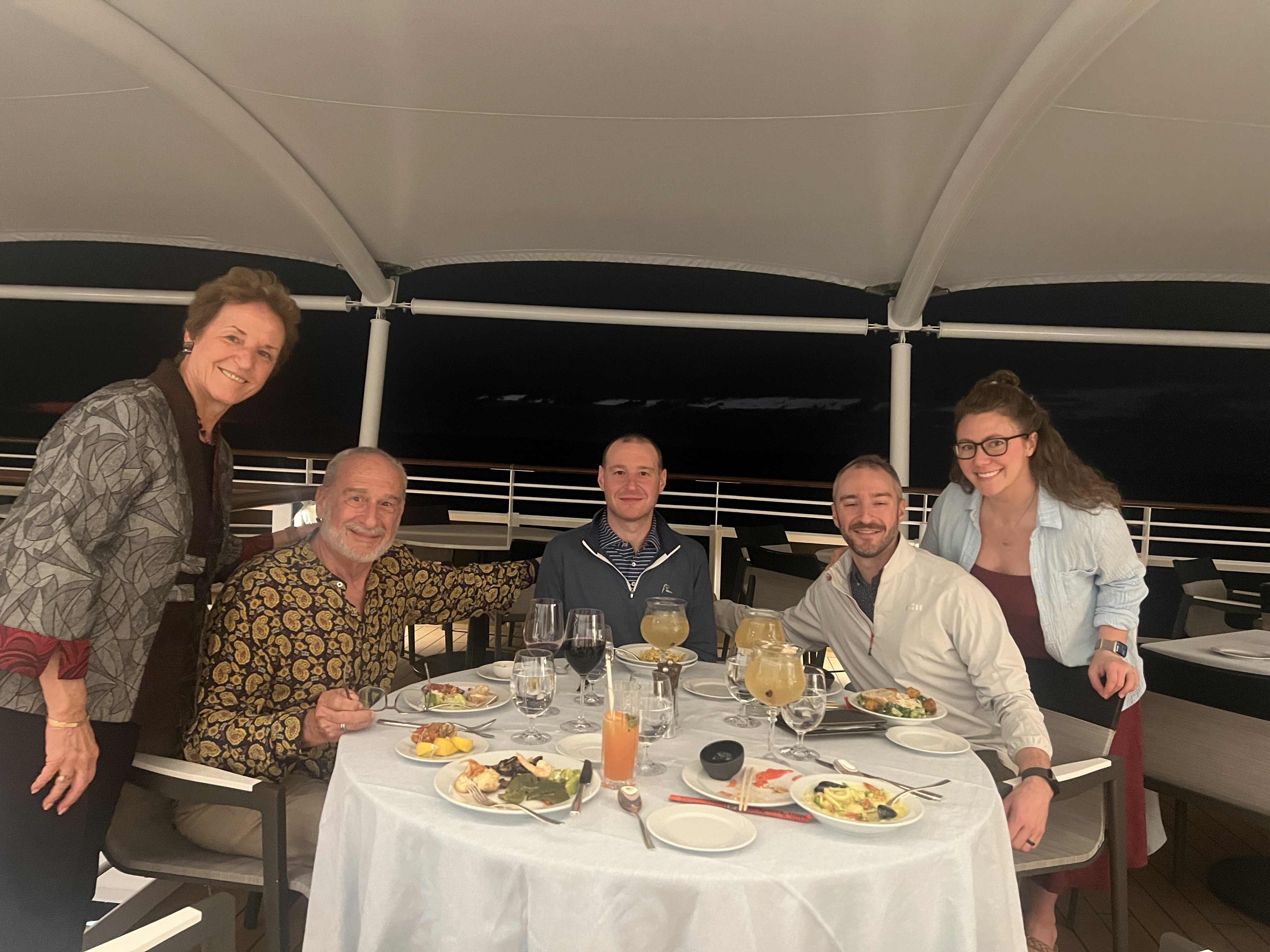 I see the shoes are still coming off after dinner for Norm 😉. Smart to have covered the deck out back of the Terrace … those tables will get more use when at sea. Just watched from our apartment balcony in Sydney as Regatta heads to White Bay. We embark today.