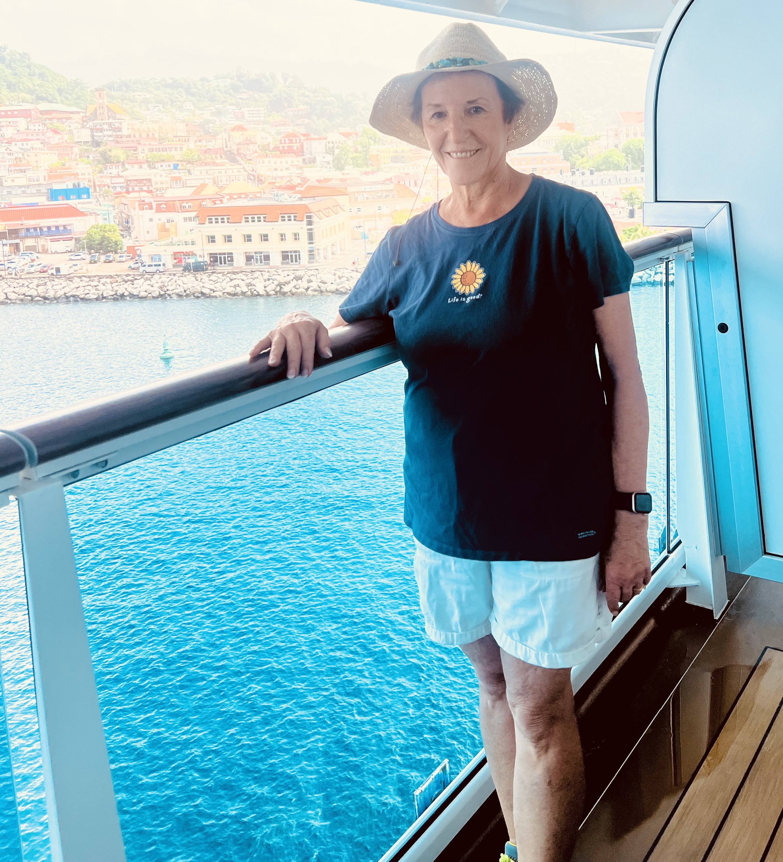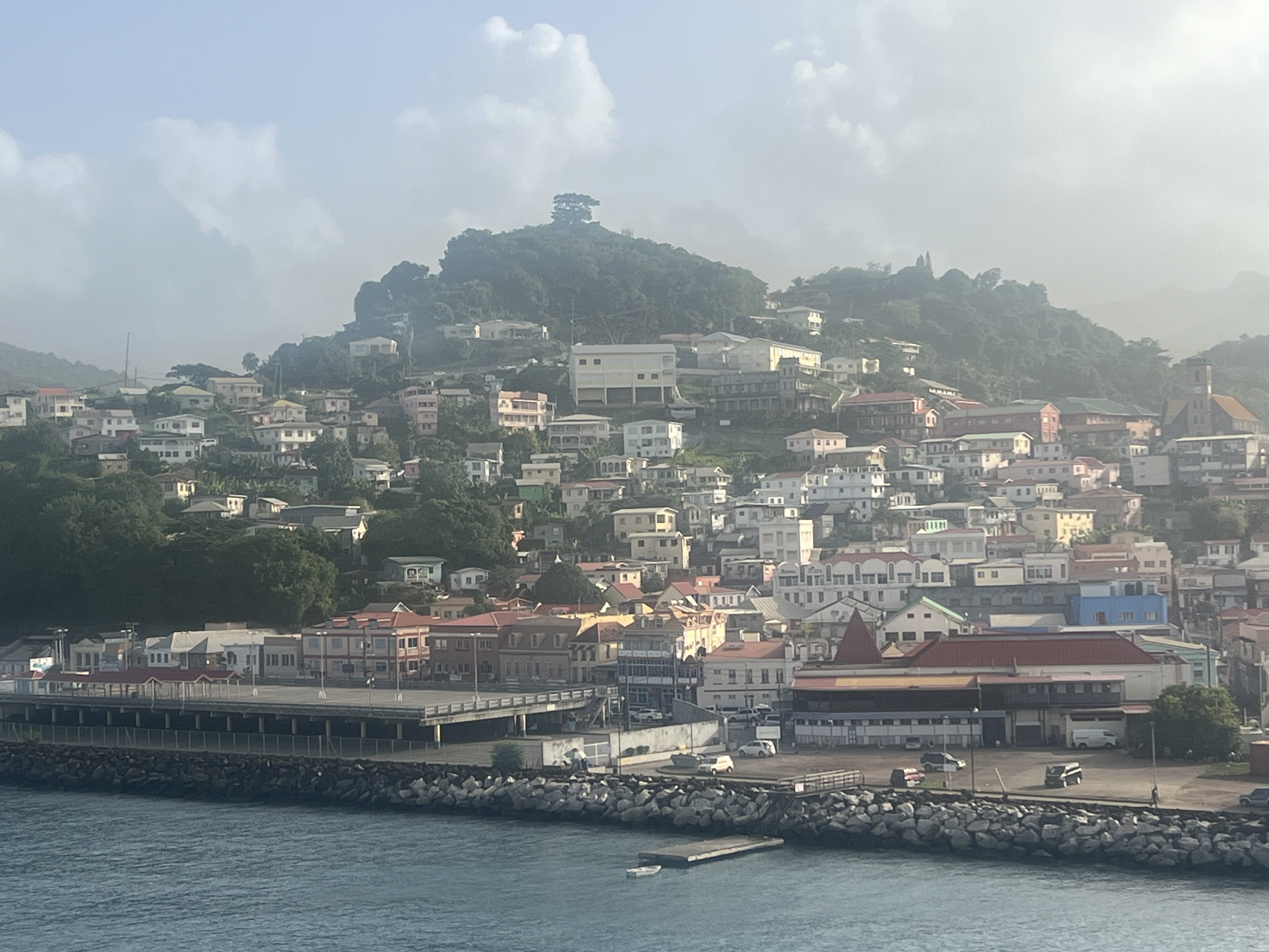 St. George’s is the capital of Grenada, a picturesque island nation in the Caribbean. It is about 90 miles from the north coast of South America and is the first in the chain of Windward Islands. It is only 21 x 12 miles in area. With its colorful waterfront houses and bustling market, the town exudes a vibrant charm. The harbor offers stunning views and is often filled with the masts of sailing boats. We can see Fort George from our ship.