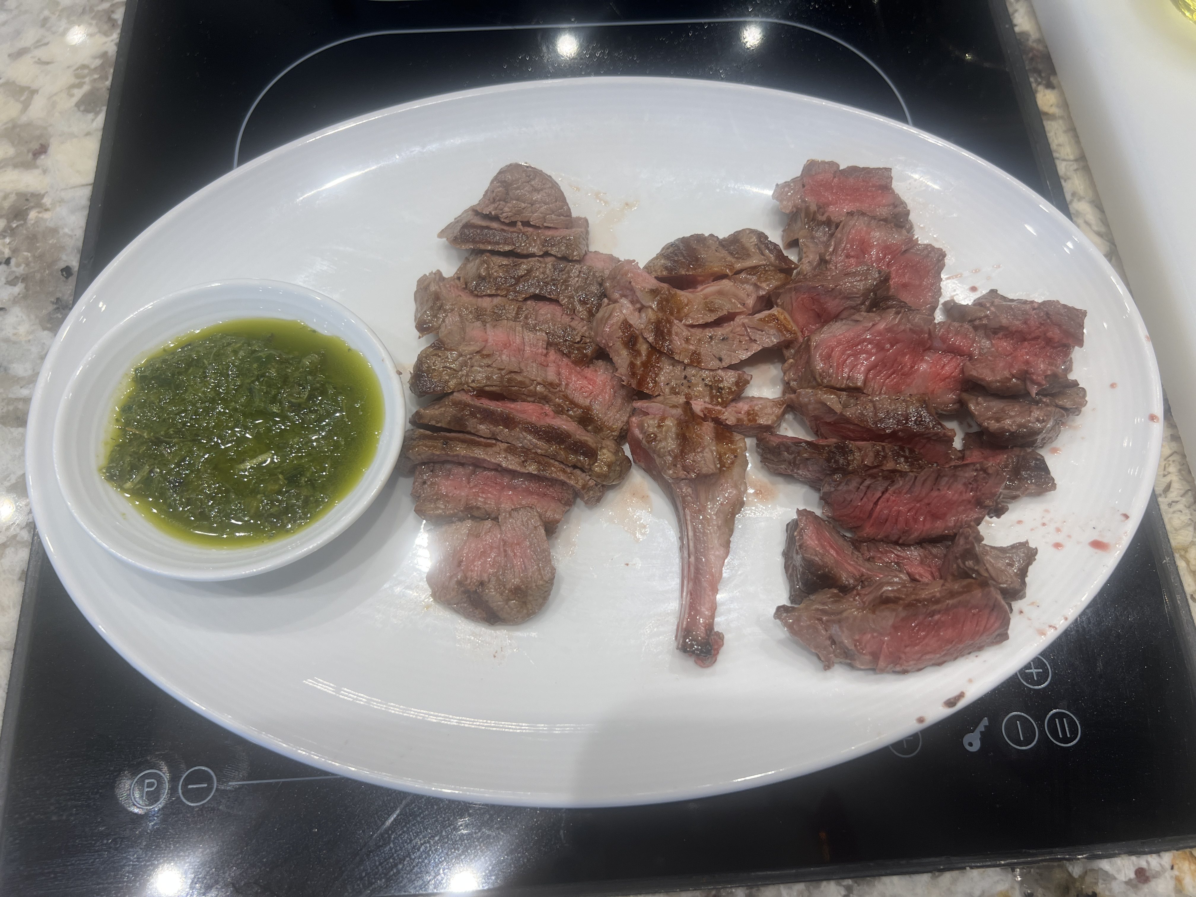 Three divas on a grill with rustic chimichurri and minty verde sauce