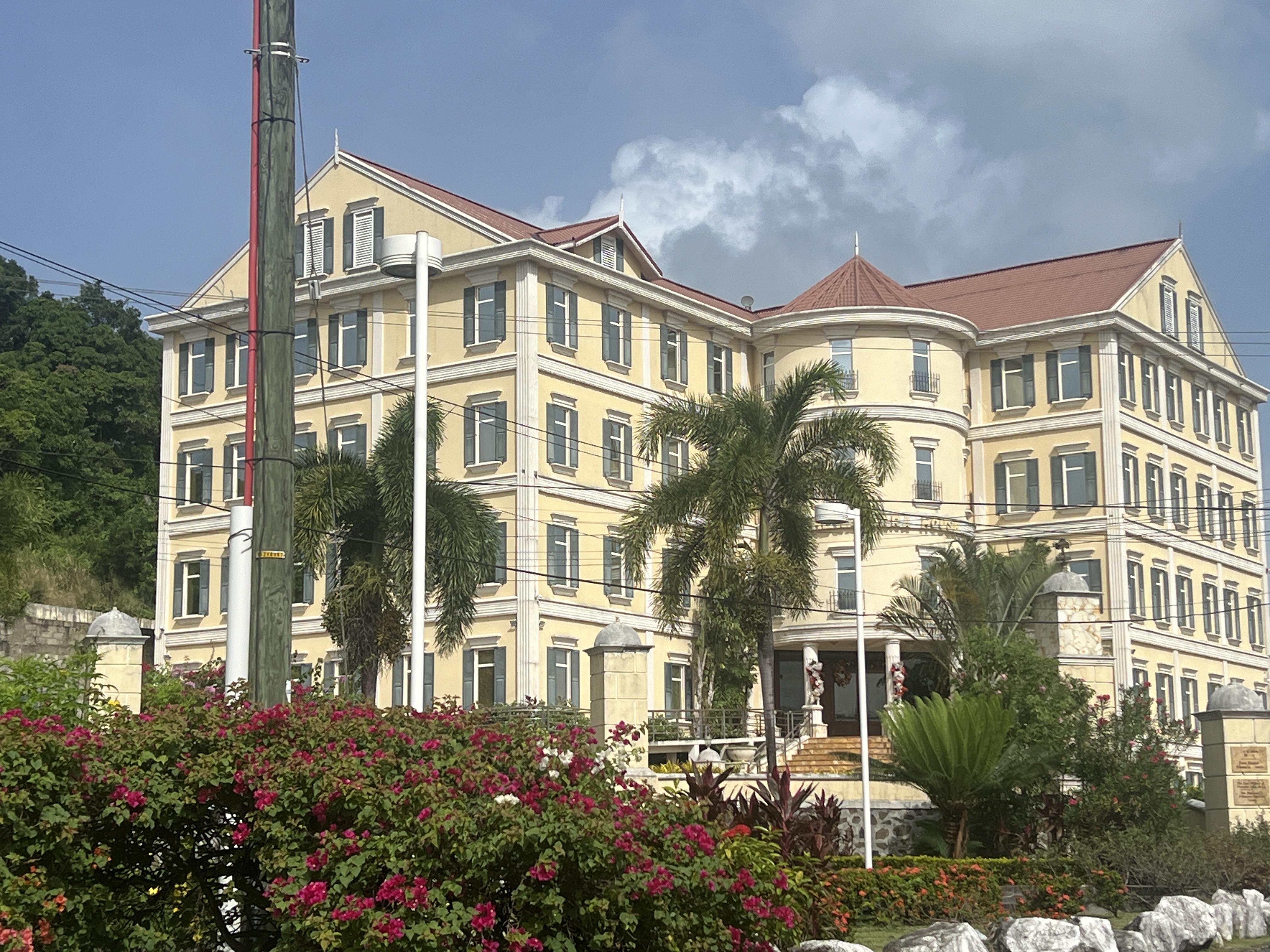 Mark and Ramsay got married in October of 2019 at a Viceroy resort in Snowmass, Colorado. They had a free night in any Viceroy hotel gifted to them for having their wedding there. But COVID interfered with being able to do that. There is a Viceroy hotel here on St. Lucia and they agreed to let Mark and Ramsay spend the day at the hotel and beach. It is about 1 1/2 hours from where our ship docked, so they hired a taxi to take and return them. This ended up being an interesting tour of the island as well as a nice beach day for them. Mark did some snorkeling along one of the large Pitons. He said the coral was pretty bleached but there were nice fish.