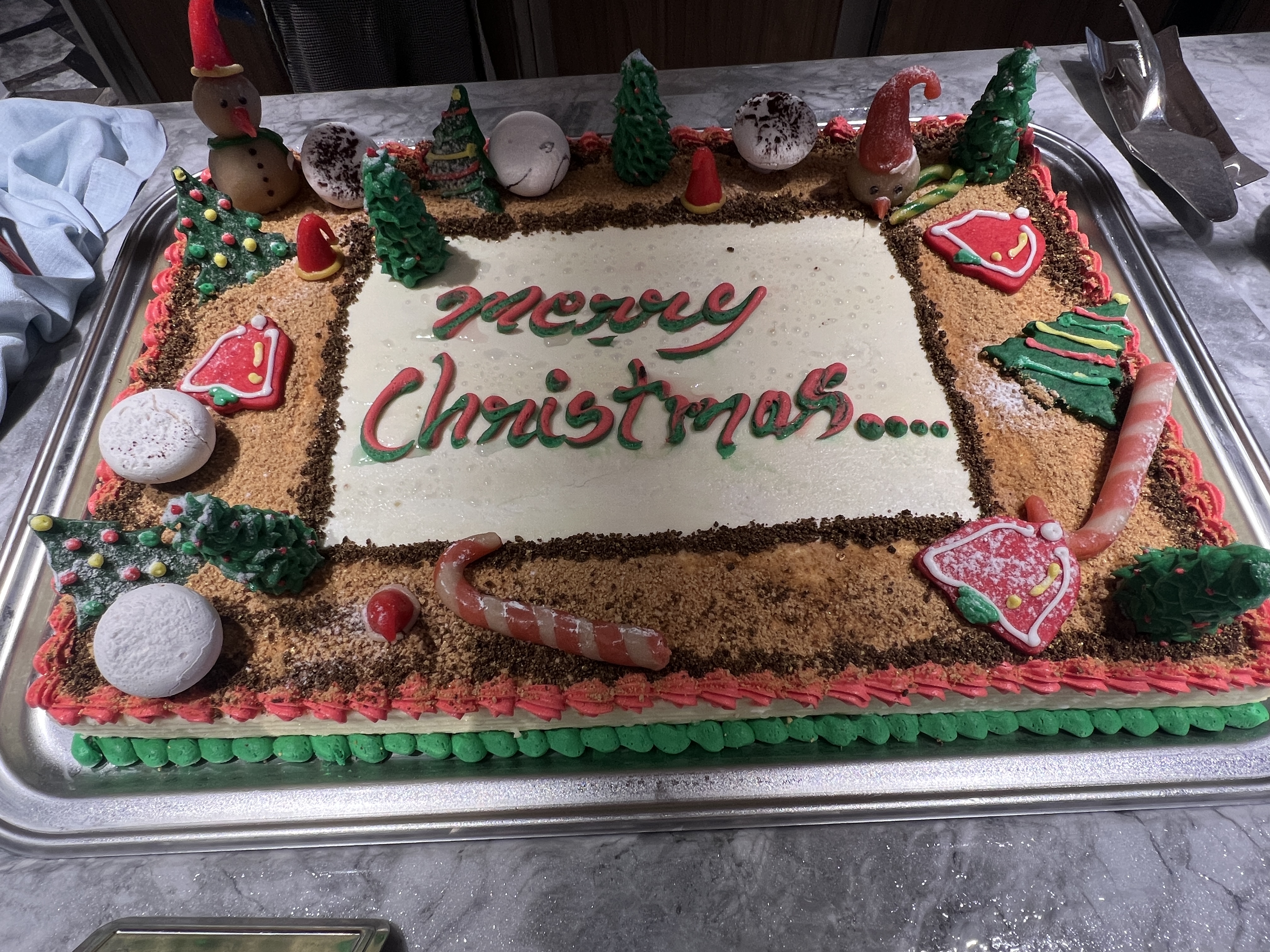After our walk, we had lunch on the ship and they had a beautiful Christmas cake. We didn’t eat any of it but they did cut and serve it. There are also frequently replenished cakes and cookies at the gingerbread village in the atrium. I try to stay away from there but the powdered Mexican tea cake cookies call my name once in a while!